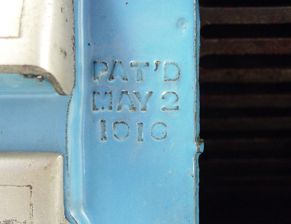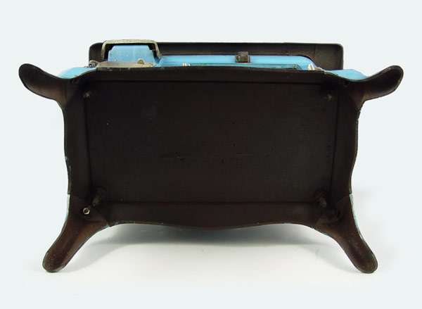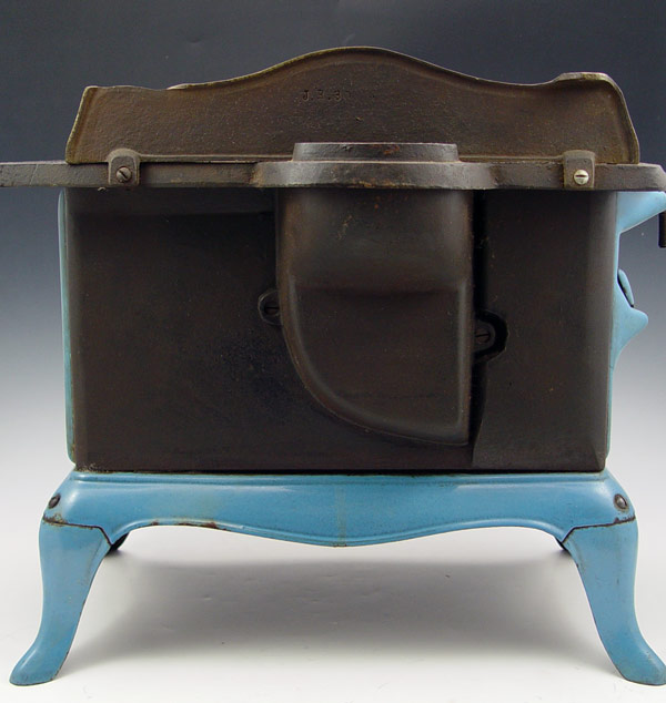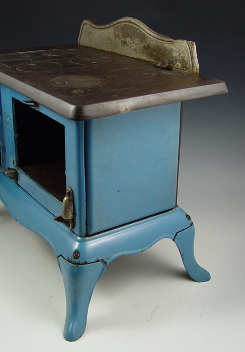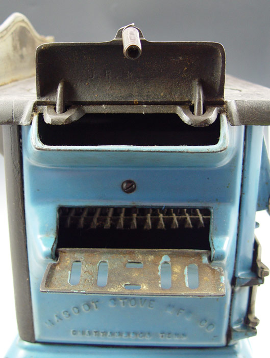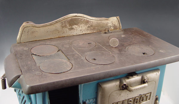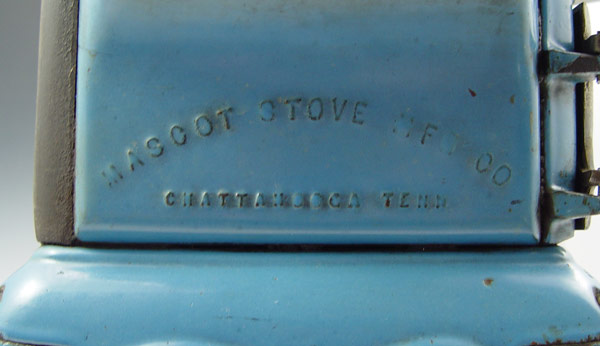 239CAST IRON MASCOT SALESMAN SAMPLE STOVE: Original blue paint, with nickel plated doors. Marked Mascot Stove Co. Chattanooga Tenn. on side, Pat'd May 2nd 1910 on front. Measures 15 1/2'' h. x 18'' x 11''. CONDITION: Note Door repair, 2 replacement burners, areas of wear and minor surface rust to finish.