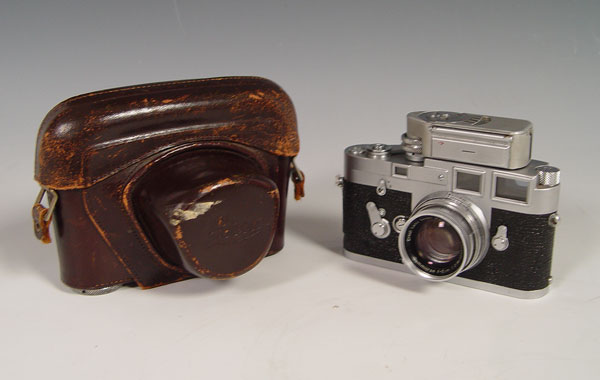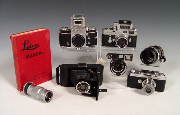 COLLECTION OF LEICA & OTHER CAMERAS & ACCESSORIES: To include 1) Leica M3 with Leica Meter and lens, number 1001451, dates to 1960. 2) Ihagee Exakta Varex IIa, no lens. Late 1950's era. 3) Argus camera. 4) Voigtlander Bessa. 5) Isco- Gottingen Tele Iscaron lens 1:2.8 / 135. 6) Leitz Wetzlar Elmar lens 1: 4 / 90. 6) Leitz Canada Summicron lens 1 : 2 / 35. 7) 1943 Leica Manual by Willard Morgan & Henry Lester.