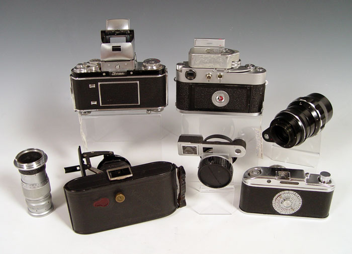 CONDITION: Please note while the cameras appear to be in good working order, we cannot guarantee cameras to be fully functioning, note loss on cover of Leica.