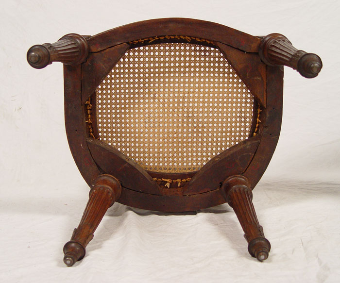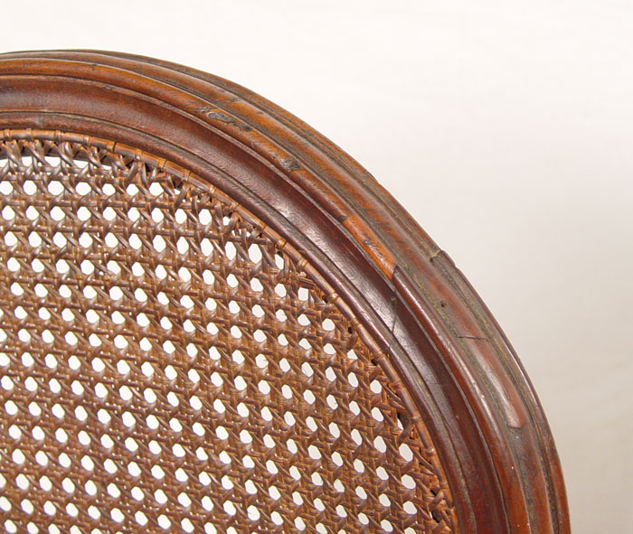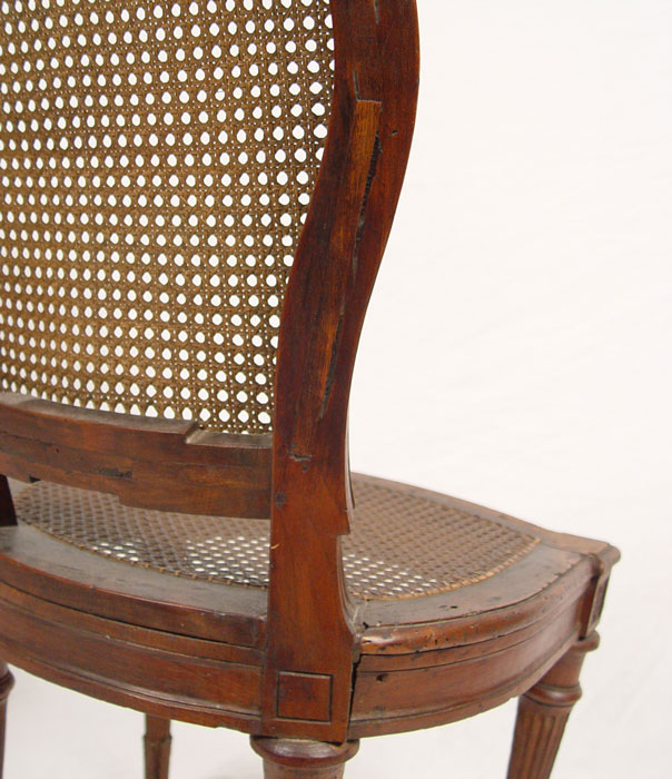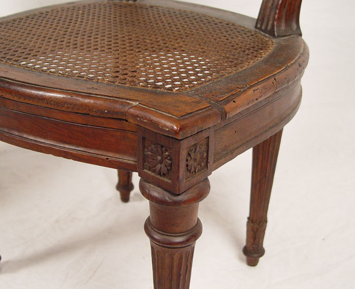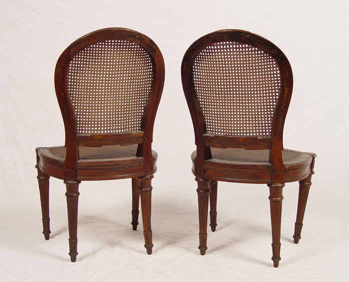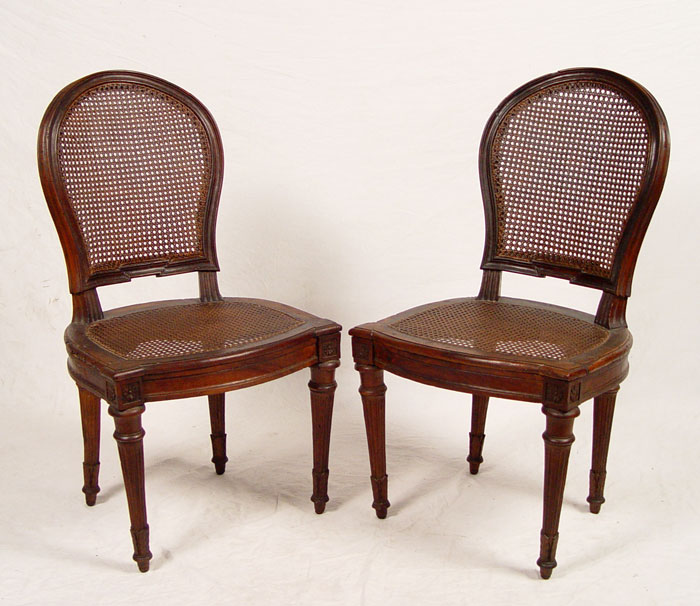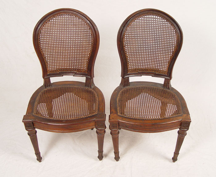 PAIR LOUIS XVI STYLE CHAIRS: Natural wood finish with deep patina. Caned back and seat, ribbed legs. 36'' tall, 22'' deep x 20'' wide.