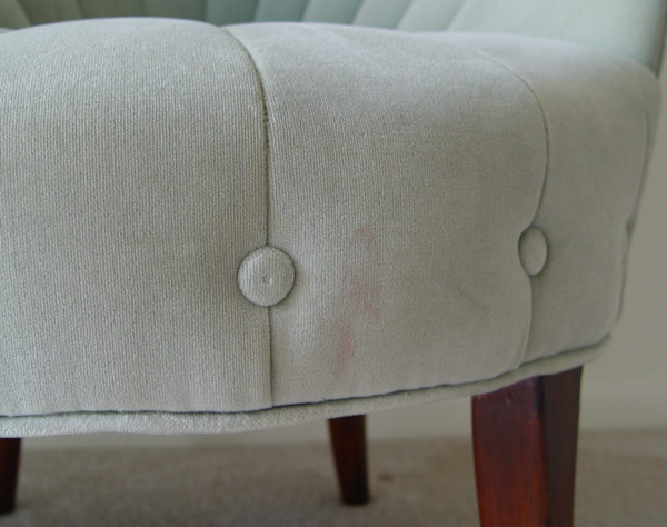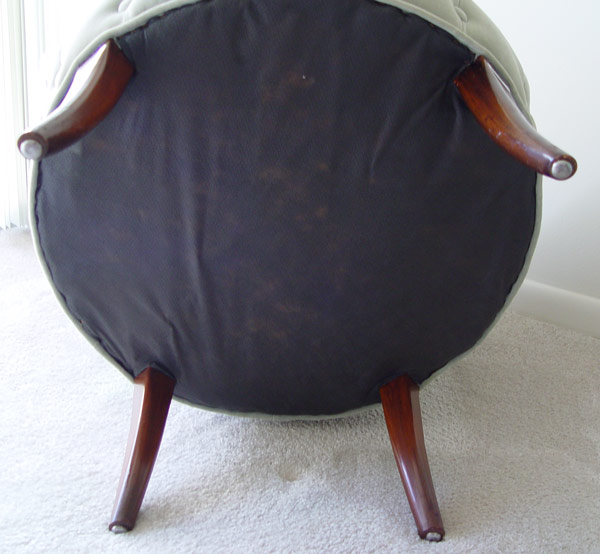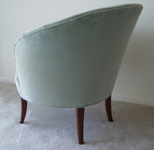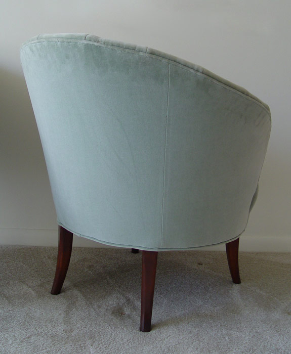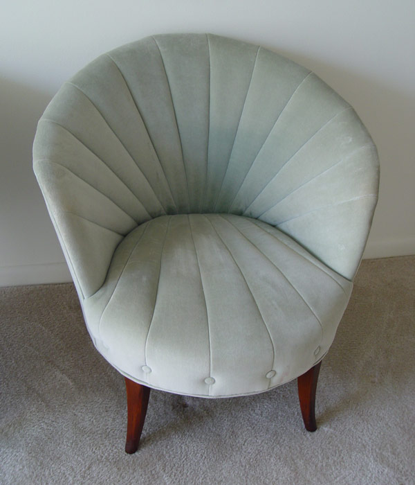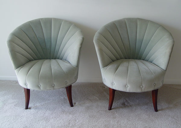 PAIR ART DECO HOLLYWOOD GLAM STYLE CHAIRS: Soft sea green in sunburst ribbed pattern. 32'' tall x 31'' x 31''.