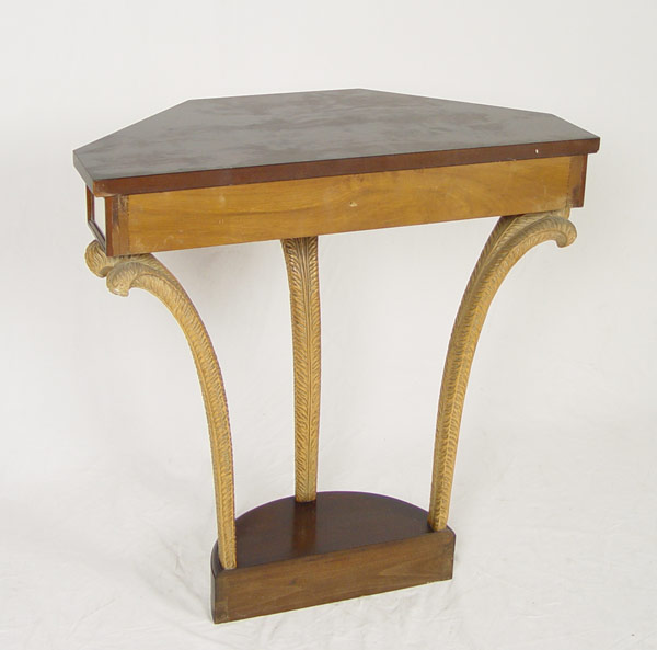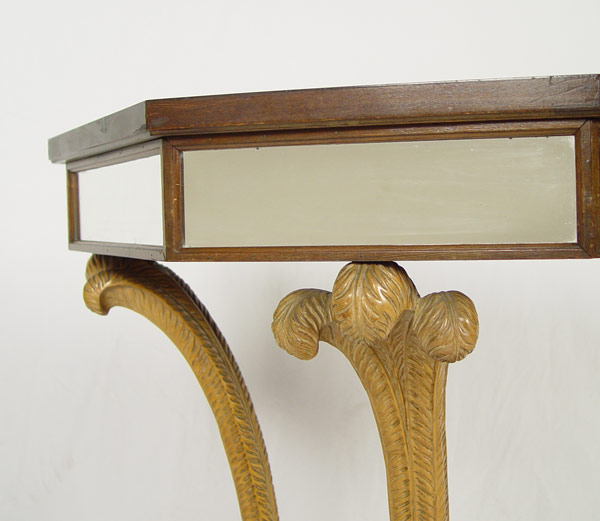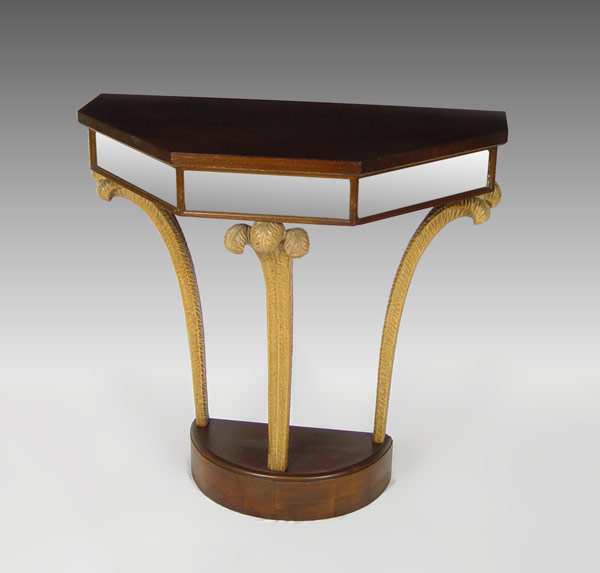 HALF OCTAGON MIRRORED FOYER TABLE: Three ostrich feather carved leg supports, mirrored apron, half round base. 32'' wide, 16'' deep, 32'' tall.