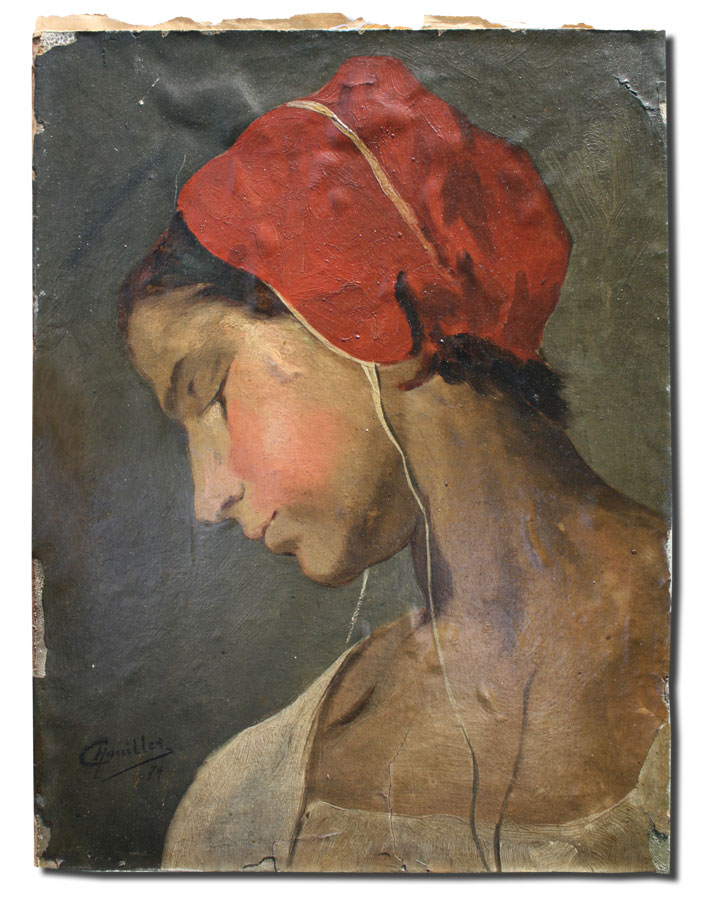 INTERESTING EARLY FRENCH? PORTRAIT: Oil/Paper/Board, 16'' x 11 3/4'', illegibly signed, newer frame under glass, 22'' x 17 3/4''.