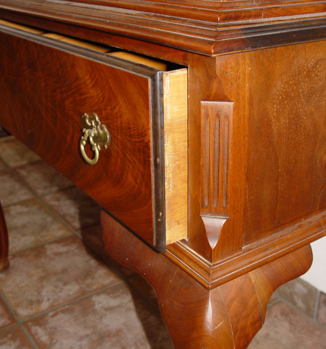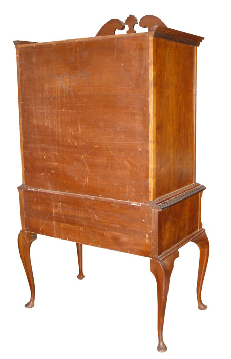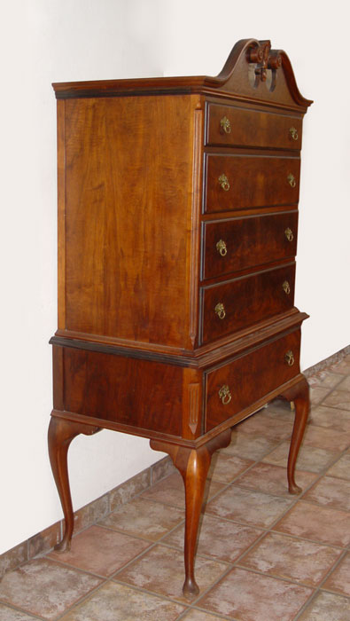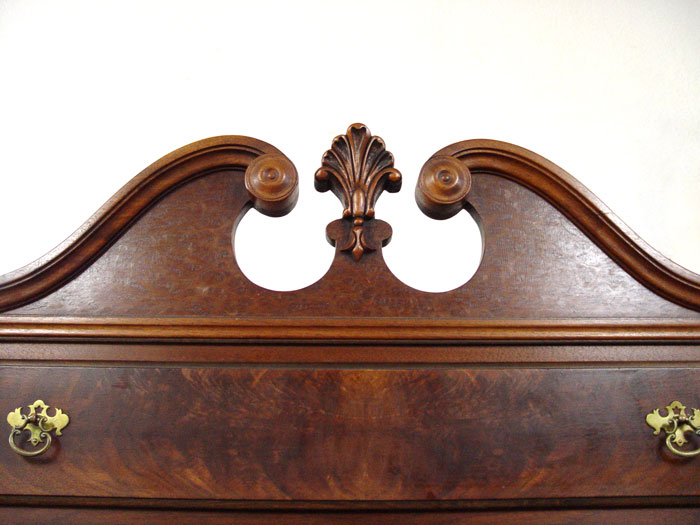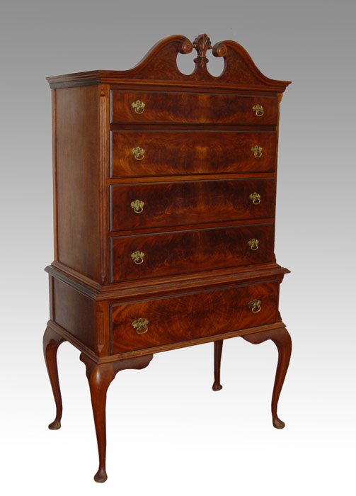 DIMINUTIVE 5 DRAWER HIGHBOY: Burl Walnut veneer arch pediment over flame mahogany drawer fronts. Graduated drawers, Queen Anne style brass drawer pulls, cabriole legs and pad foot. Nice condition. 68'' x 25'' x 23''.
