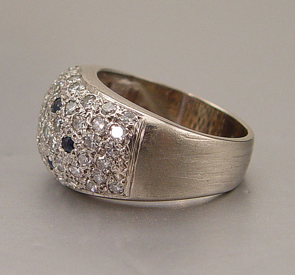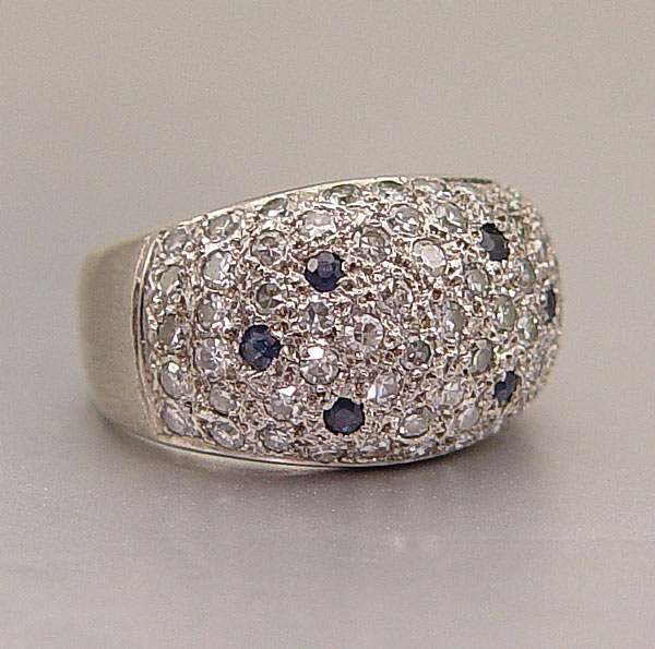 14K DIAMOND AND SAPPHIRE PAVE RING: 14k white gold ring with approx. 62 single cut diamonds, approx. 1.08 Ctw., averaging VS2-SI in clarity and H-I color. Accented with 6 sapphires. Size 6. Weight 10.1 grams.
