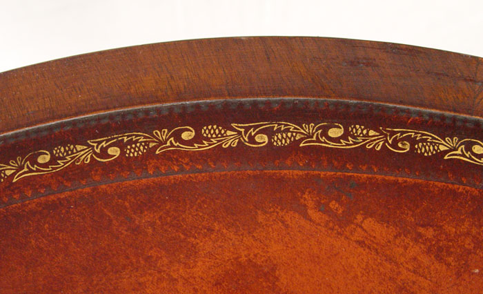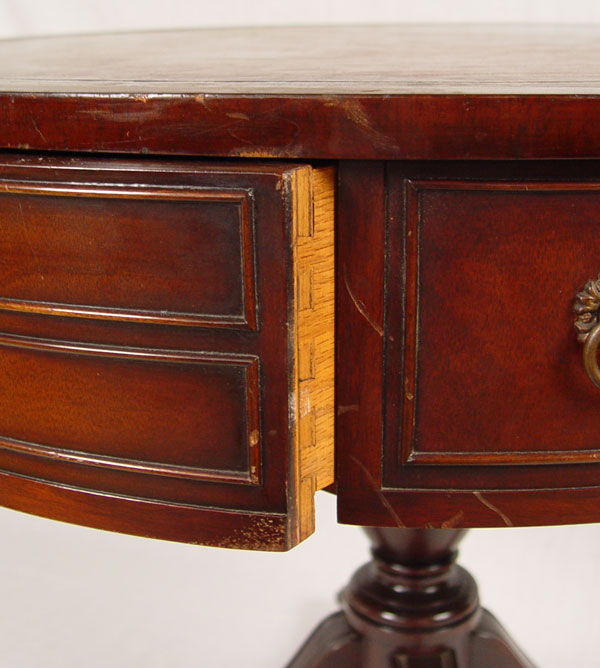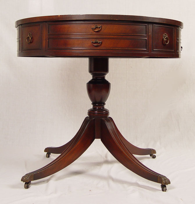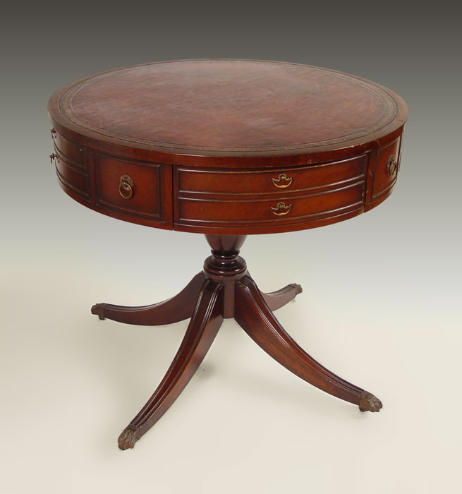 MAHOGANY LEATHER TOP DRUM TABLE: Gold embossed leather top, single drawer and false front drawers. Turned pedestal base on curved legs, brass paw feet, castors. 28 3/4'' h. x 32'' dia.