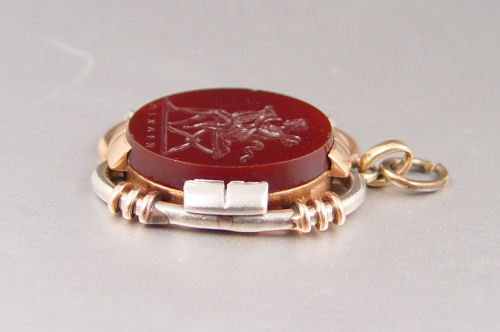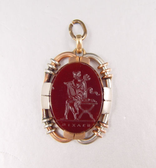 18K CARNELIAN INTAGLIO PENDANT: 14K rose and white gold pendant contains one oval shaped 22.00 x 17.0 mm intaglio depicting a seated muse. Prong set. Weight: 9.8 grams.