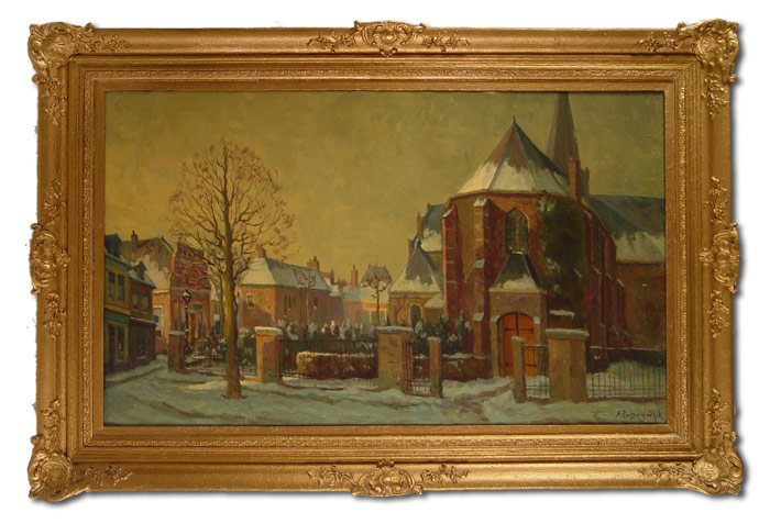 ZUIDERWIJK, Adrianus, (1852-): Winter European Snowy Village with Church, OIL/Canvas, 25 3/4'' s 33 1/8'', signed, gilded gesso frame with repair and gold paint, 35'' x 52''. Estate of Gerry Van Der Heuvel-Donovan, Pat Nixon's press secretary.