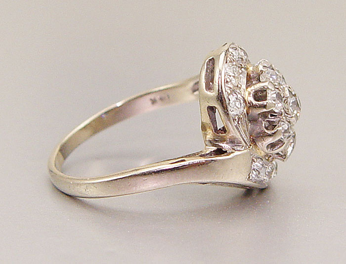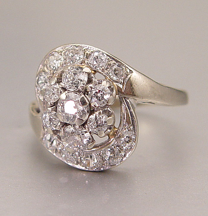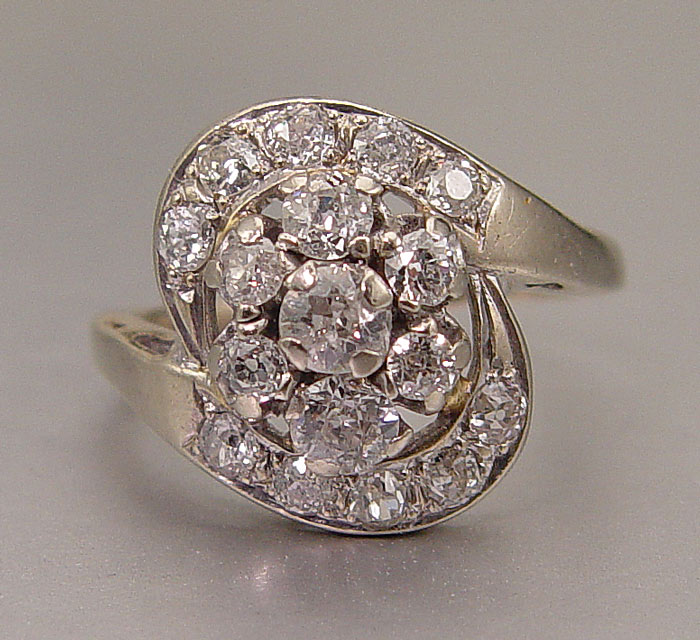 14K DIAMOND FASHION RING: 14 K white gold ring contains 17 old mine and old European cut diamonds, approx. 2 .25 Ct., averaging H-I color, SI - I clarity. Sixe 7.75 Weight: 4.66 grams.