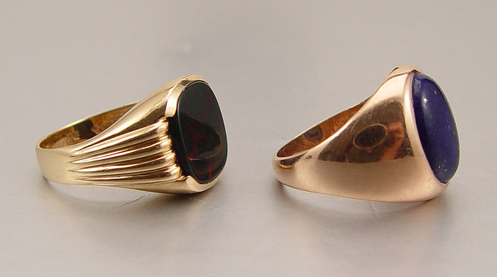 2 MENS RINGS 14K LAPIS AND BLOODSTONE: 1) 14K yellow gold ring contains one 16.00 x 12.00 mm oval shaped cabochon cut piece of lapis lazuli. The lapis is bezel set. Weight: 10.8 grams 2) 14K yellow gold ring contains one 14.00 x 12.00 mm cushion shaped tablet cut piece of bloodstone. The bloodstone is half-bezel set. Weight: 8.4 grams Both are size 10.
