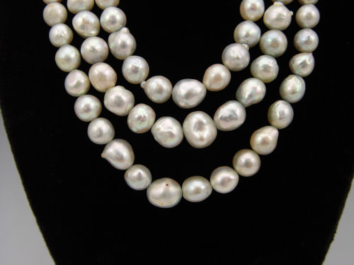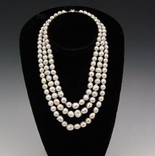 A TRIPLE STRAND NECKLACE OF SILVER BAROQUE PEARLS: 7-12 mm. pearls, the strands are 15-18''. The 14K white gold clasp is set with 8 sapphires and 2 seed pearls.