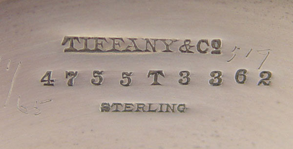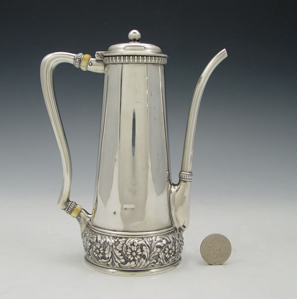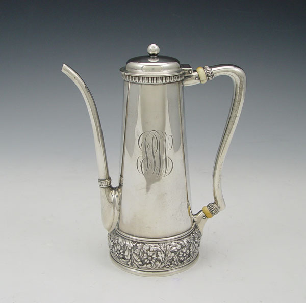 TIFFANY & CO. STERLING COFFEE POT: Floral repousse ring around base, bone or ivory accent rings. Hinged lid. Marked Tiffany & Co. Sterling 3 1/2 Gills on base. Monogrammed. Measures 7'' h.. Approx. 11.3 troy oz.