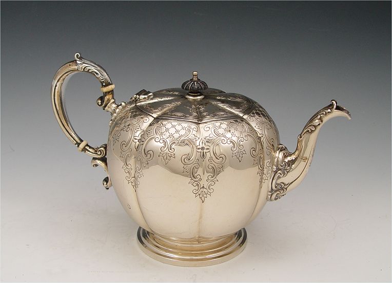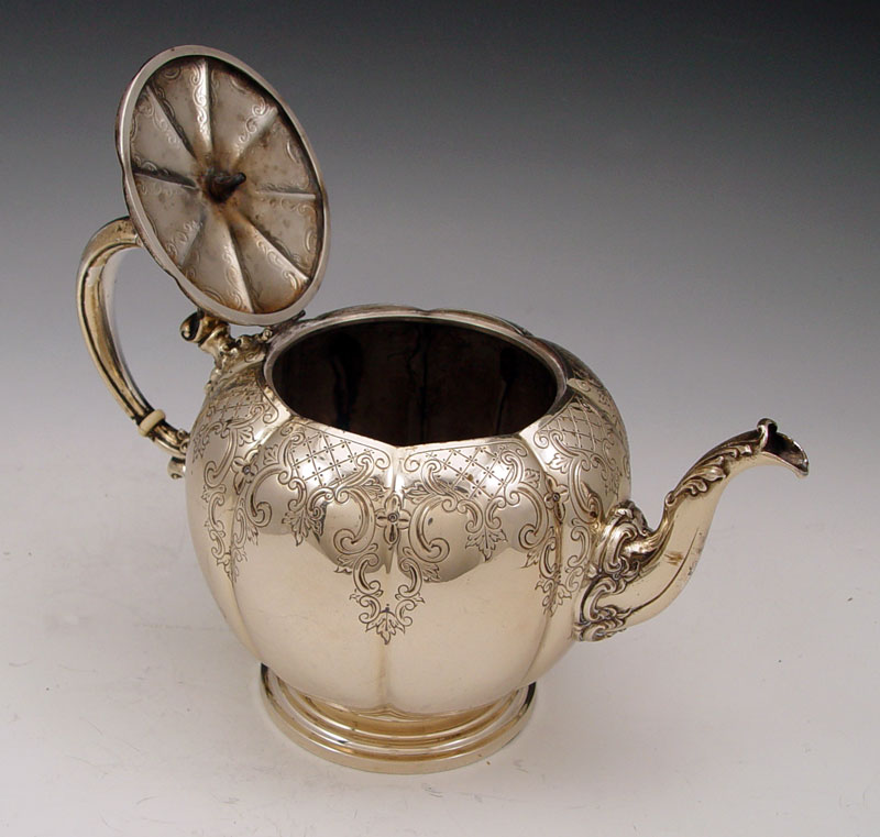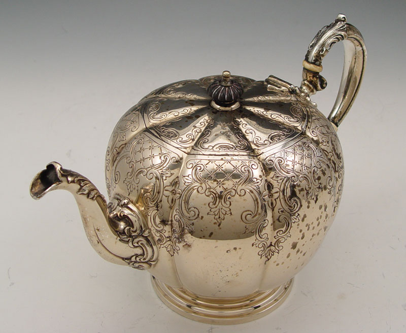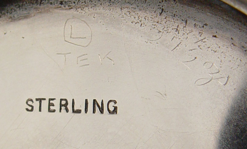 EMBOSSED STERLING TEAPOT: Embossed foliate scroll and geometric designs with ivory or bone heat cushions. Simply marked Sterling with hand scratched L in circle and TEK on base. 6 1/2'' h. x 10 3/4'' x 5 3/4''. Approx 27.4 troy oz.