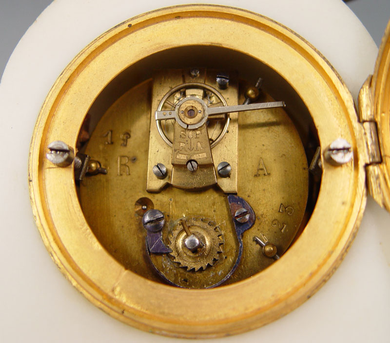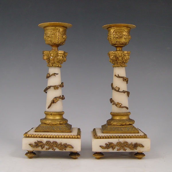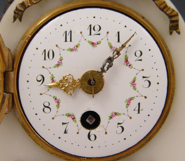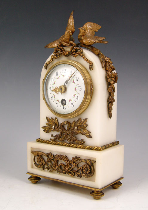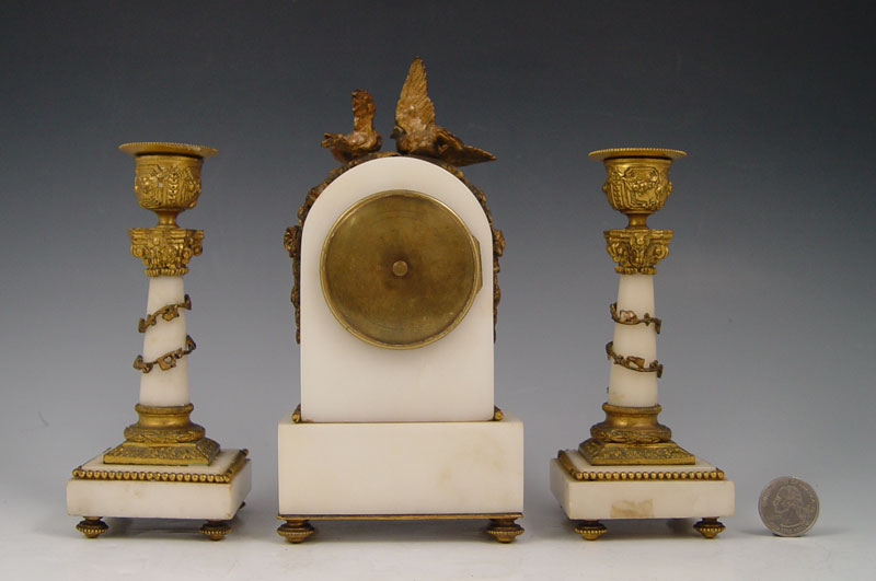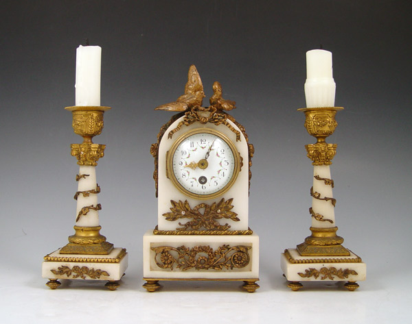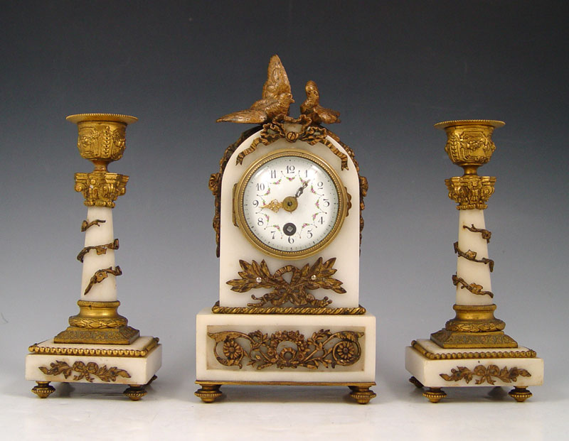 DIMINUTIVE FRENCH MARBLE CLOCK GARNITURE SET: White marble and ormolu decoration case featuring doves, ribbon and garland. Bubble glass bezel, hand painted face. Key wind movement. Matching single light candle stands. Unmarked as to maker or retailer. Clock measures 7 3/4'' h. x 4'' x 2 1/2''. Candle stands 6 1/8'' x 2 1/2''.