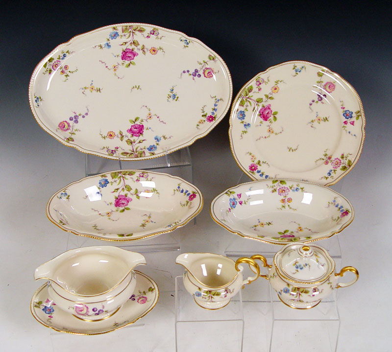 CASTLETON ''SUNNYVALE'' FINE CHINA SERVICE: 47 pieces to include platter, oval vegetable, creamer, sugar, gravy boat with attached underplate, 6 dinner plates, 12 cups, 10 saucers, 3 cream soups, and 10 bread plates.
