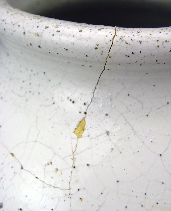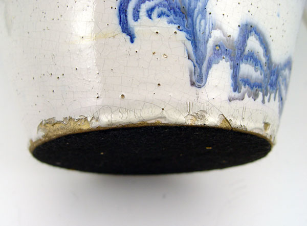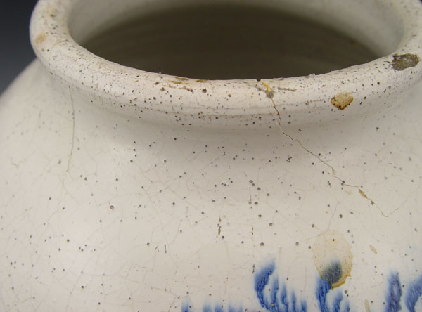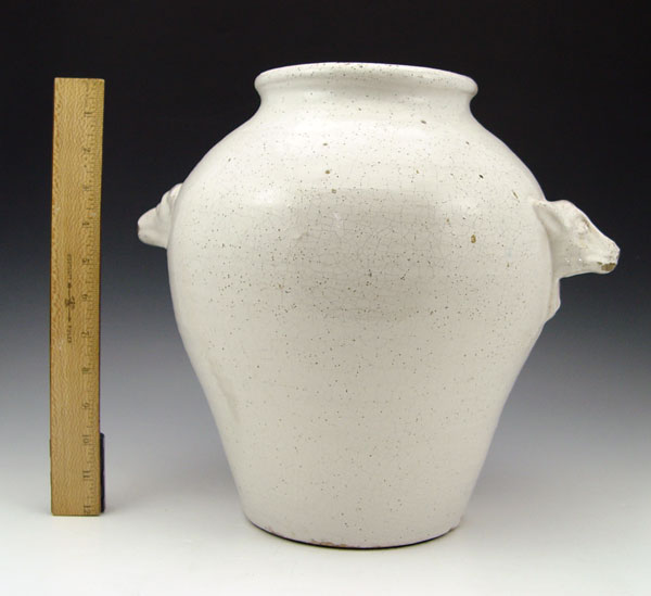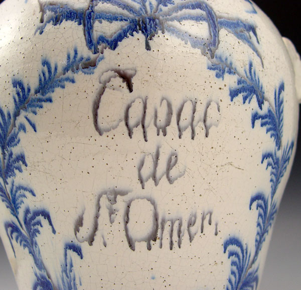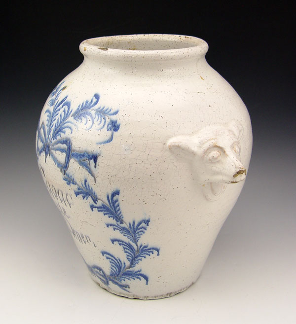 STONEWARE CAVAC DE ST AMEN VESSEL: With figural dog or lion head handles. Blue glaze floral and bow decoration. Measures 12 1/2'' h. x 13 1/2'' h.