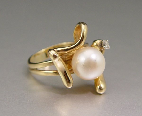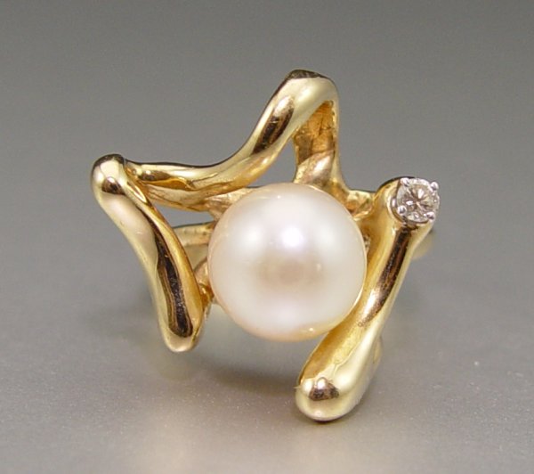 14K PEARL & DIAMOND RING: 14K CULTURED PEARL & DIAMOND RING: 14K yellow gold ring contains one 9.50 mm cultured pearl and one round brilliant cut diamond. Weight: .08 Ct. Approx. Rated VS in clarity and H-I in color. The pearl is peg set. The diamond is prong set. Weight: 8.1 grams. Size: 6.5.