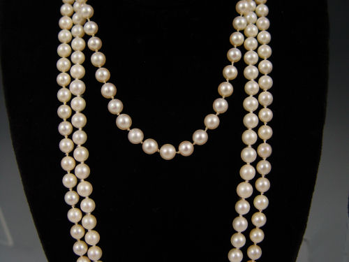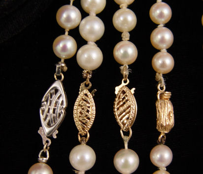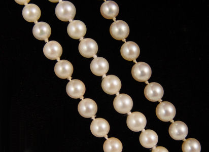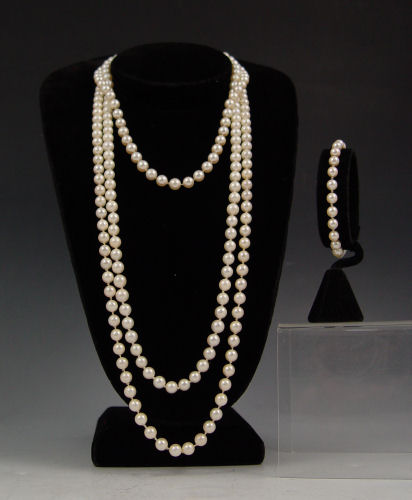 3 CULTURED PEARL STRAND NECKLACES AND A BRACELET: Drench yourself in cultured pearls. 1) A 24'' strand of 6.5 mm. 2) A 24'' strand of 6 mm. 3) A 16'' strand of 5.5 - 6 mm. 4) a 7'' bracelet, 5.5-6 mm. The clasps are 14K.