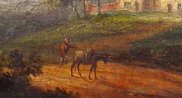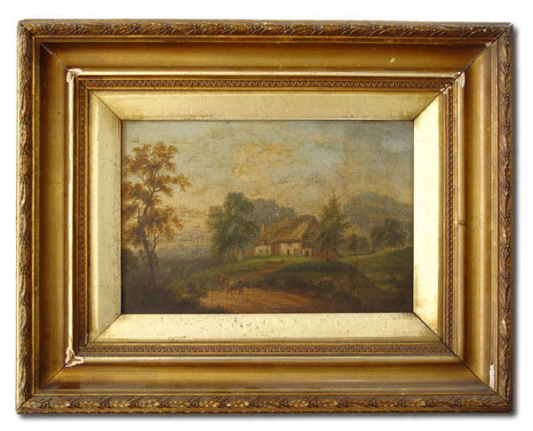 SMALL COTTAGE SCENE POSSIBLY BY HENRY HARRIS; Oil/Canvas, 8'' x 12'', faint pencil marking to stretcher verso, worn period gilt frame, 15'' x 19''.