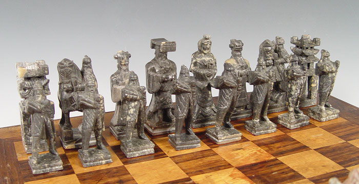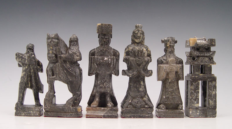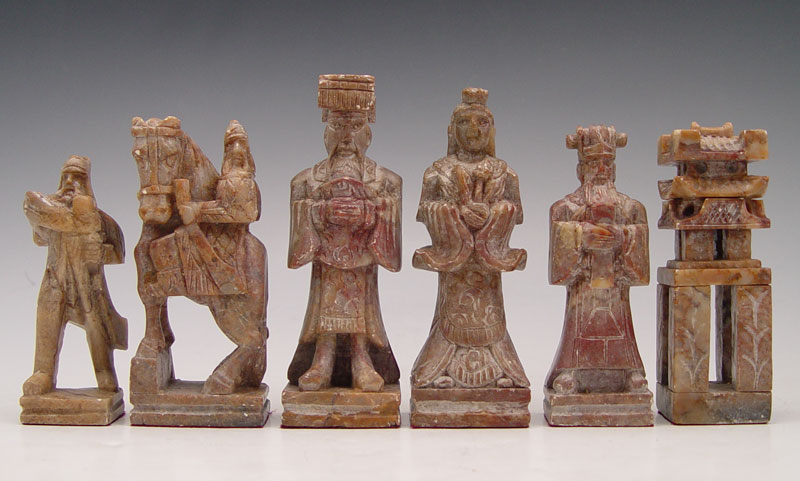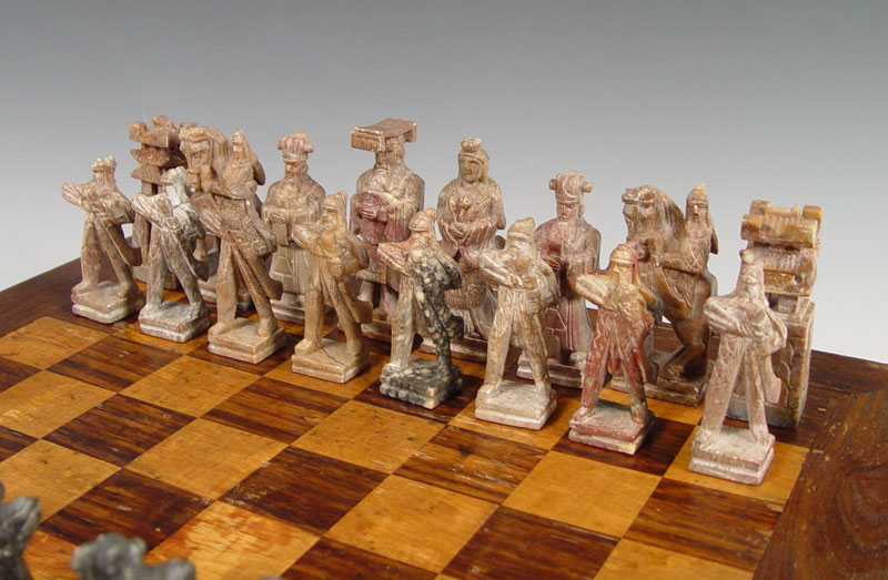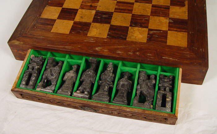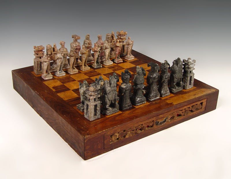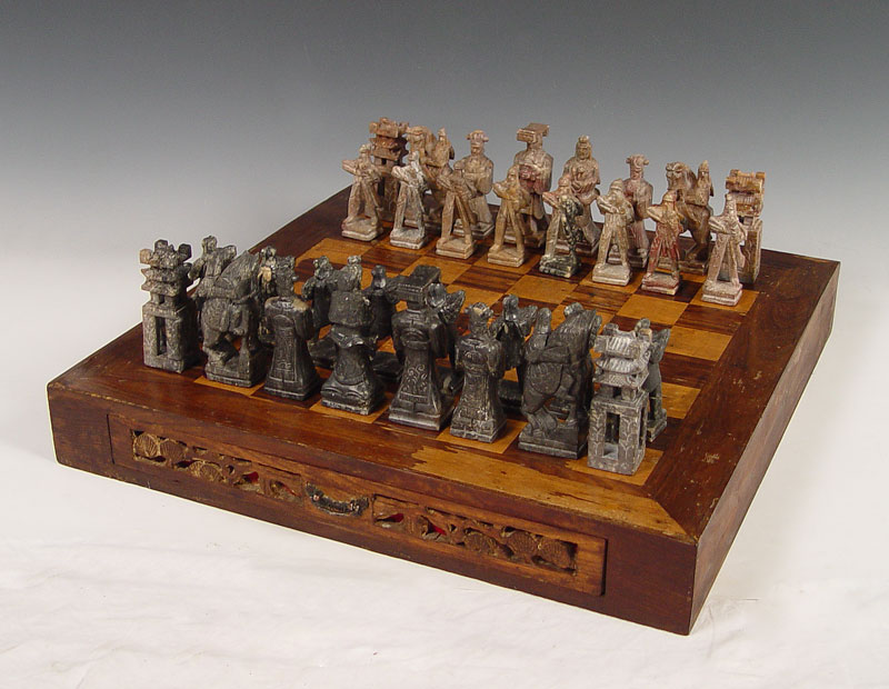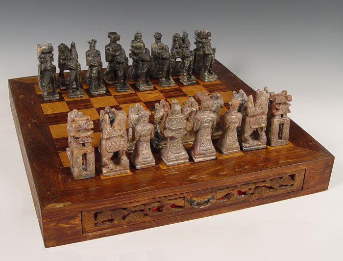 LARGE CHESS BOARD WITH CARVED SOAPSTONE PIECES: Chinese carved soapstone pieces, marquetry inlaid board with 2 carved front drawers. King measures 5''. Complete set. Board measures 3'' x 22 1/2'' square.
