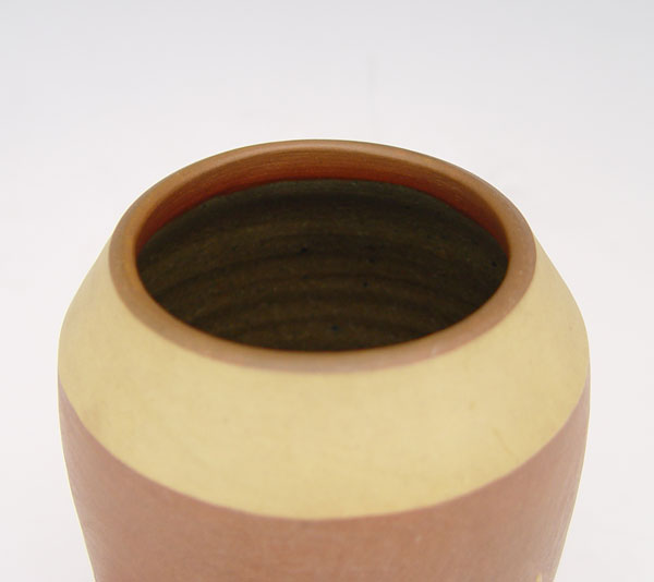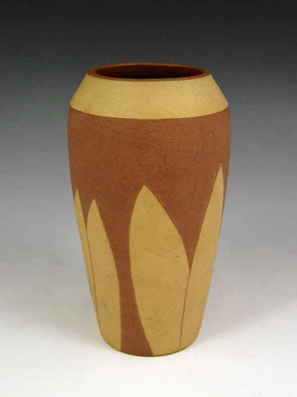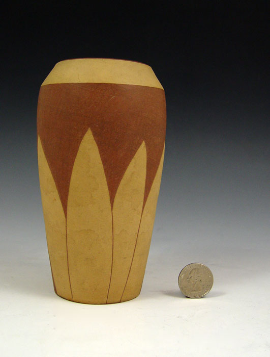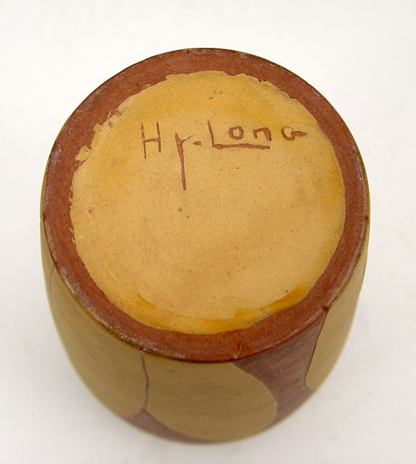 HY-LONG ART POTTERY VASE: Relief leaf design with burgundy background. Incised Hy-Long on base. 6'' h. x 3 1/2'' dia.