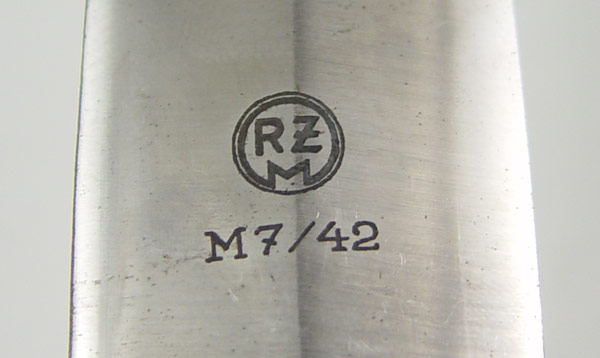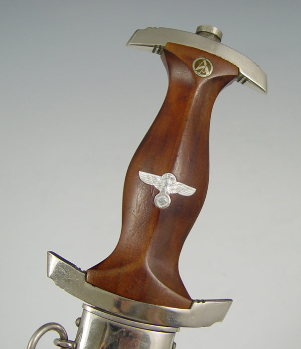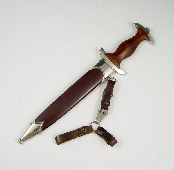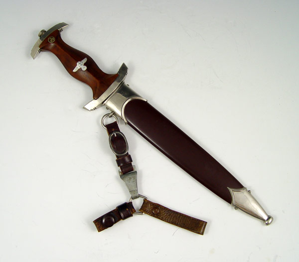 WWII GERMAN SA DAGGER: M7 / 42 factory markings with clear motto on 8 3/4'' blade. Wood handle with emblem and SA. Original scabbard and leather hanger. Overall 14 3/4'' in scabbard.