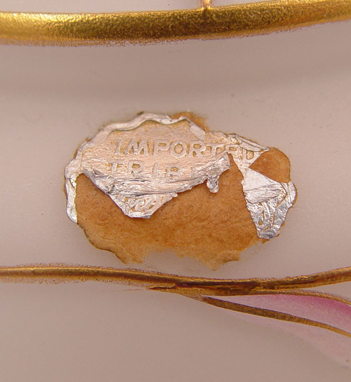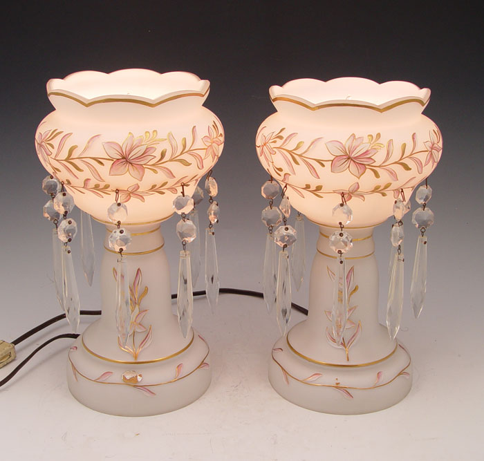 PAIR SATIN GLASS LUSTER LAMPS WITH PRISMS: Hand painted gilt decoration. These have always been electric lamps. 10 1/2'' tall.