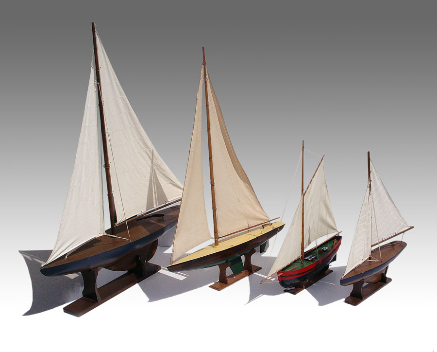 COLLECTION OF 4 POND BOATS: Circa early to mid 20th century, largest measures 40'' h. x 29 1/2'' x 4 3/4''. All come with wood stands.