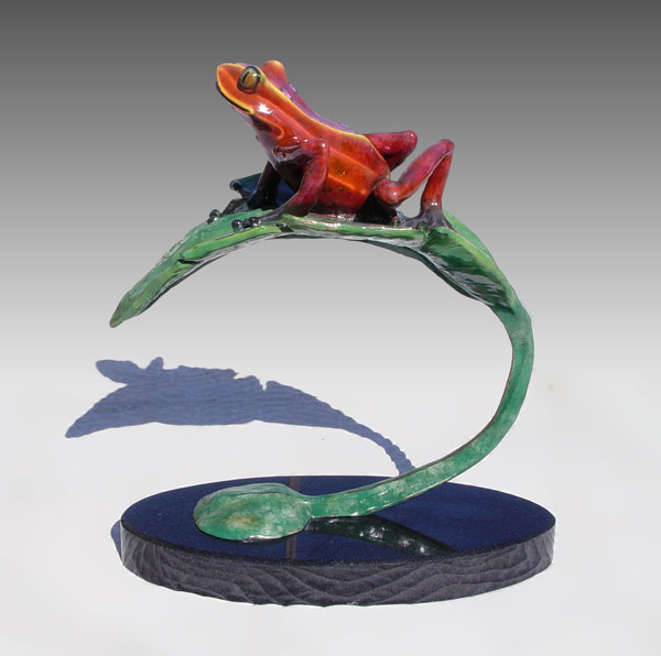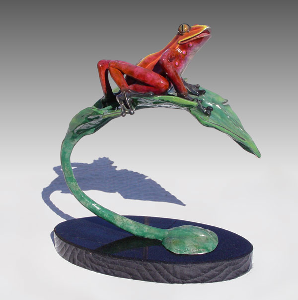SIGNED PATINATED BRONZE FROG ON LILY PAD: Illegible signature, 18'' h., 17'' w., numbered 37/399, affixed to heavy polished granite plinth, 17 1/2'' x 8''.
