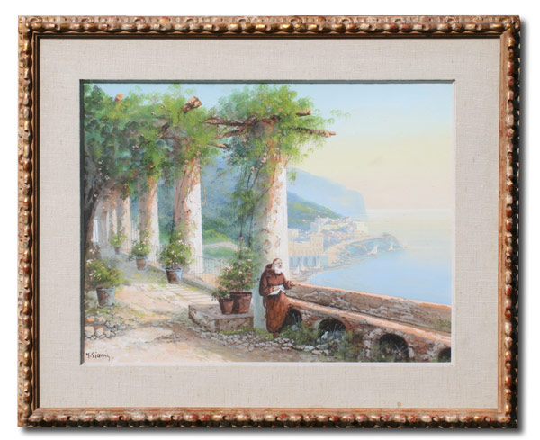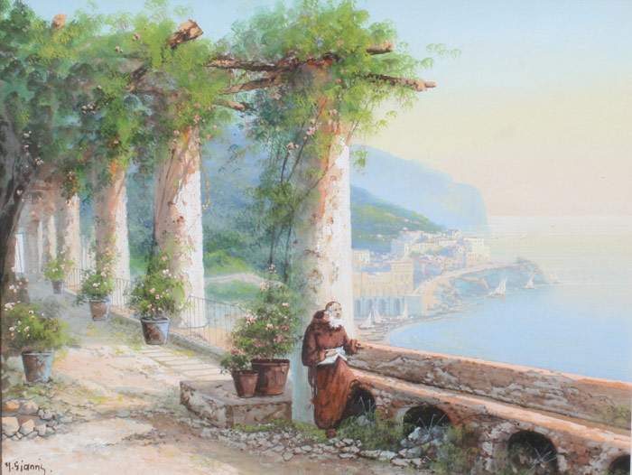 GIANNI, Y., (Italian, 20th C.): Neapolitan Scene with Monk Seated in Ruins Overlooking the Bay of Naples, Gouache, sight size 19'' x 25'',signed, framed, 28 1/2'' x 34 1/2''.