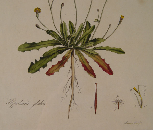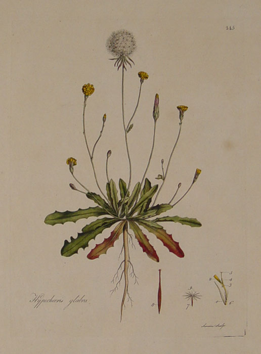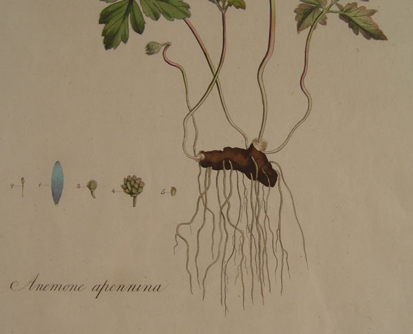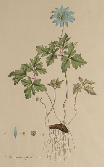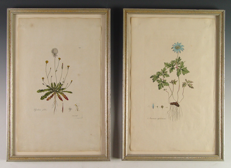 CURTIS, William, (British, 1746-1799): 2 piece pages from Flora Londinensis to include 1) Hypochaeris Glabra (Smooth Cats Ear), Color Engraving, 18 1/2'' x 11 1/4'', framed 21'' x 14 1/4''. 2) Anemone Apennina (Apennine Anemone), Color Engraving, 18 1/2'' x 11 1/4'', framed 21'' x 14 1/4''.