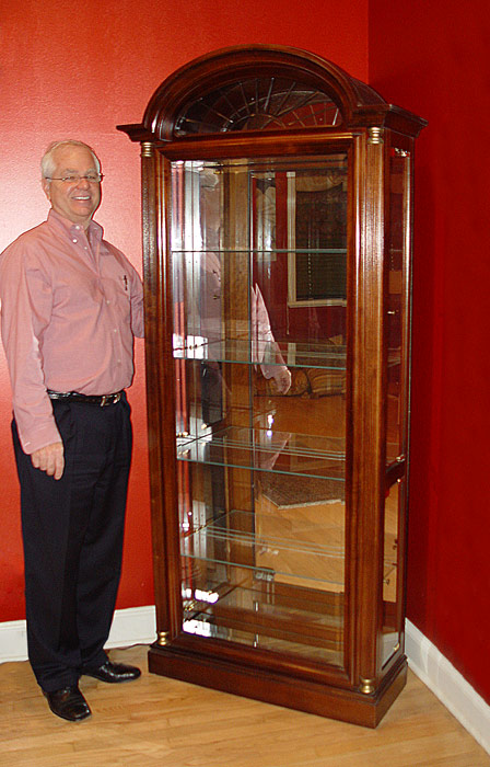 PULASKI CONTEMPORARY BONNET TOP DISPLAY CABINET: Rayed glass over glass front. Side door entrance. Interior illuminated, glass shelves, mirror back. 79'' tall x 35'' wide x 13'' deep.