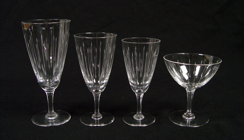 VAL ST LAMBERT CRYSTAL STEMWARE: 32 piece etched stems to include 10 water goblets (6 3/4''), 10 sherbert champagnes (4 3/8''), 7 wine (5 7/8''), 5 wine (5 1/2''). Signed.