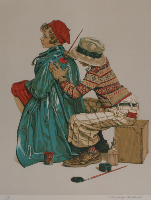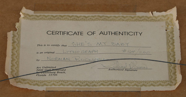 ROCKWELL, Norman, (American, 1894-1978): ''She's My Baby'', Lithograph, sight size 27'' x 13 3/4'', pencil signed and numbered 164/200, signed with certificate of Saturday Evening Post cover, framed, 36'' x 28''.