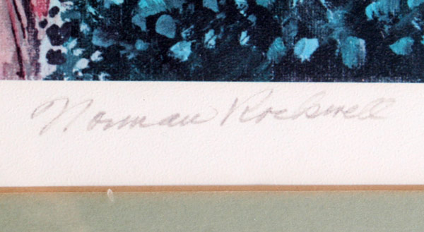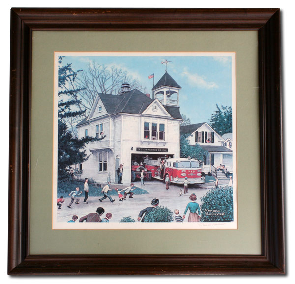 ROCKWELL, Norman, (American, 1894-1978): Stockbridge Fire Department, Lithograph, sight size 23 1/2'' x 23'', pencil signed, worn wood frame, 35'' x 34'', damaged plexiglass.