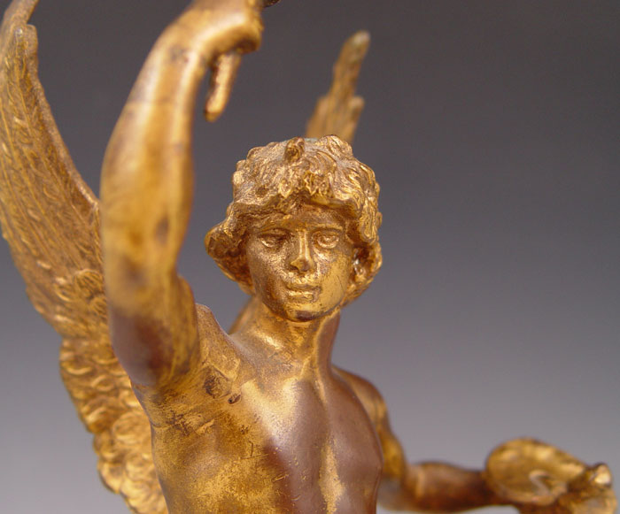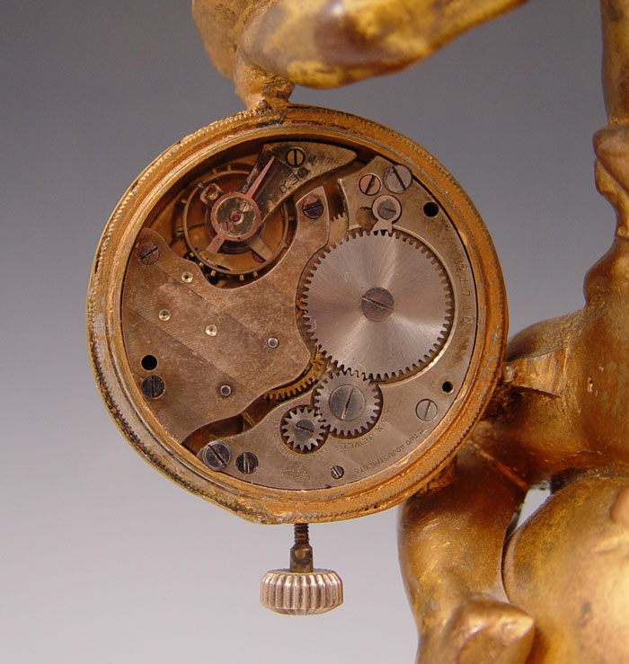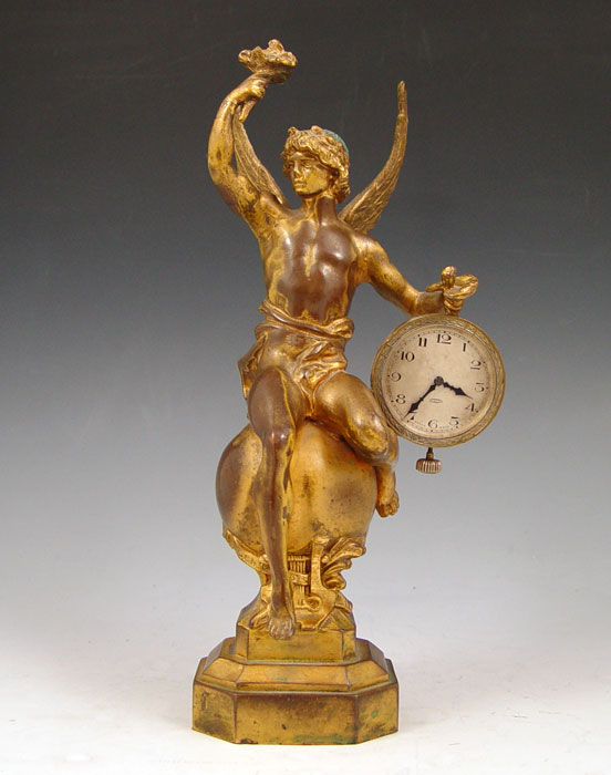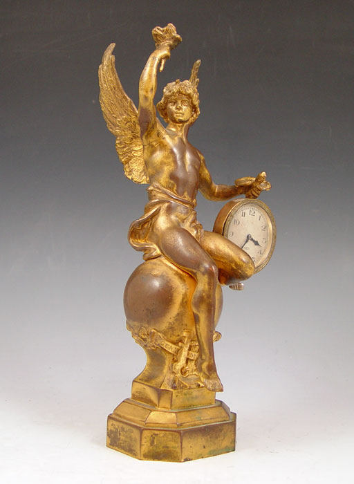 BRONZE FIGURAL CLOCK: Figure of Mercury seated on globe. Swiss made pocketwatch style 8 day 6 jewel movement signed L. Sandoz Vuille. 10 3/4'' h. x 5'' x 4''.