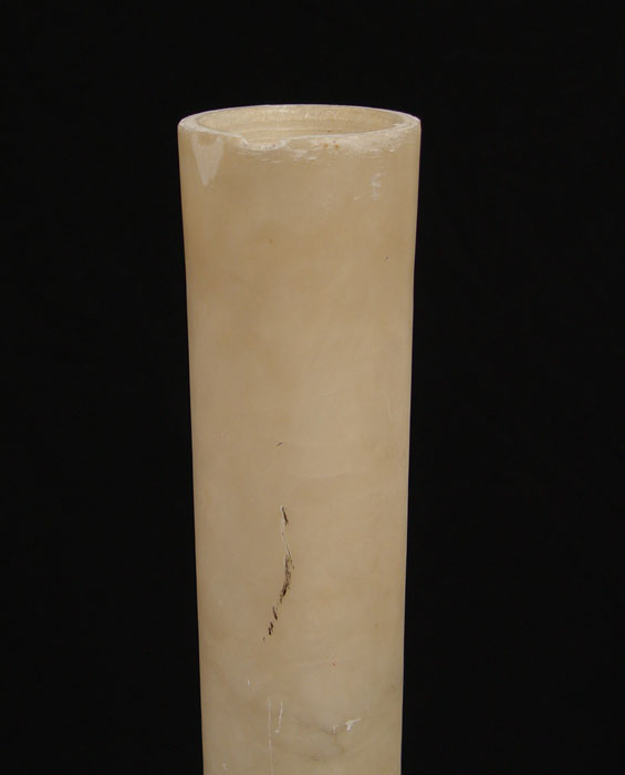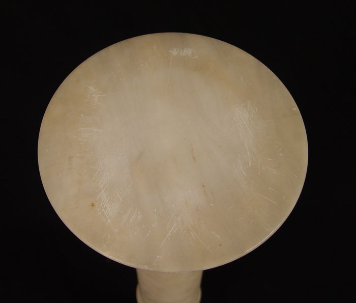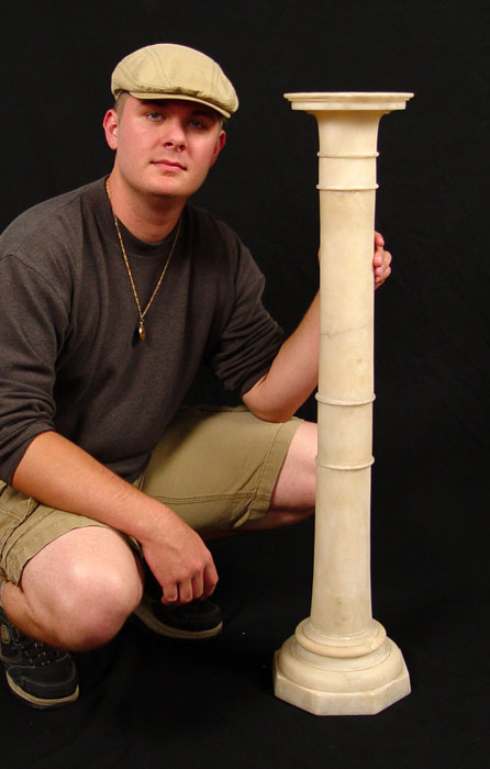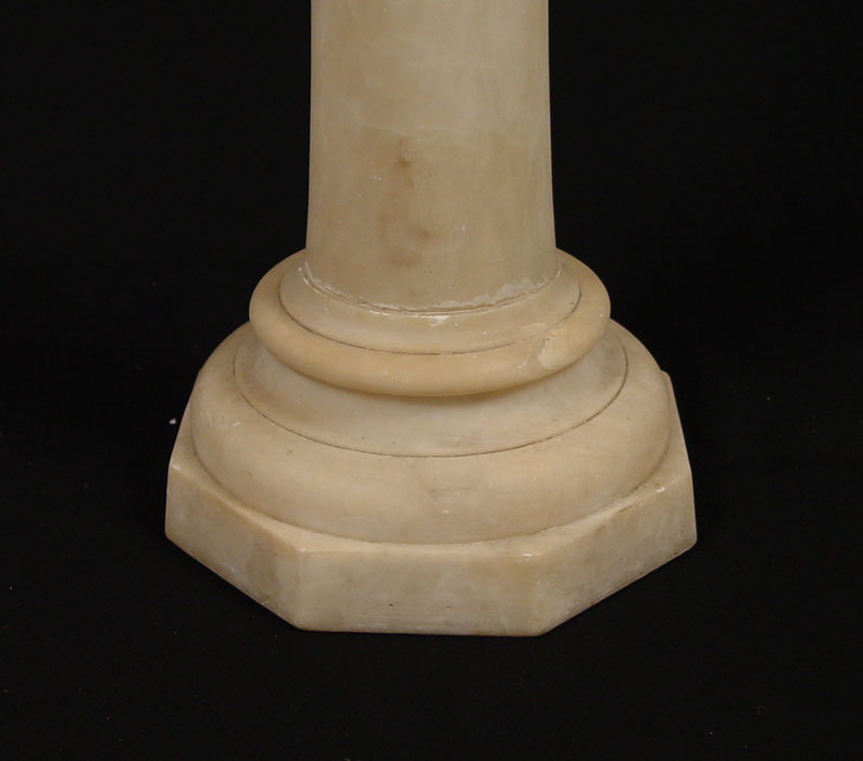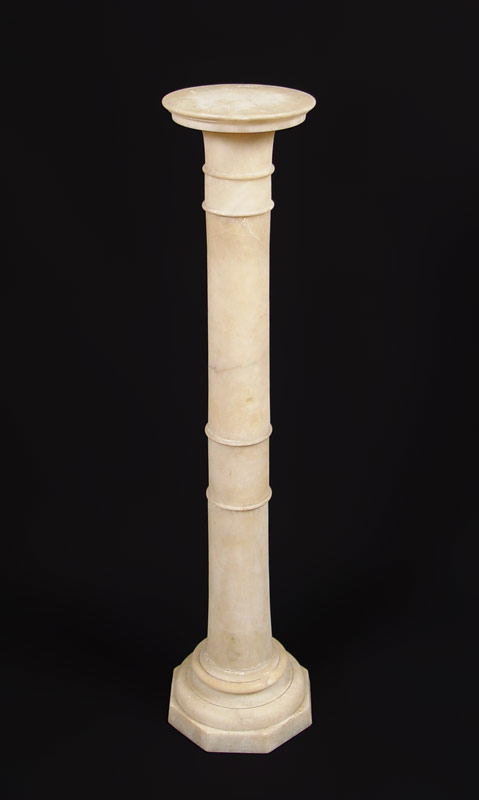 WHITE MARBLE PEDESTAL: Slender pedestal with rotating top. Round top on cylinder pedestal with octagon base. In three parts. 9'' round, 40'' tall.