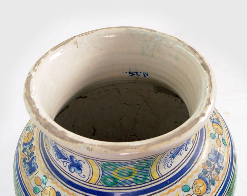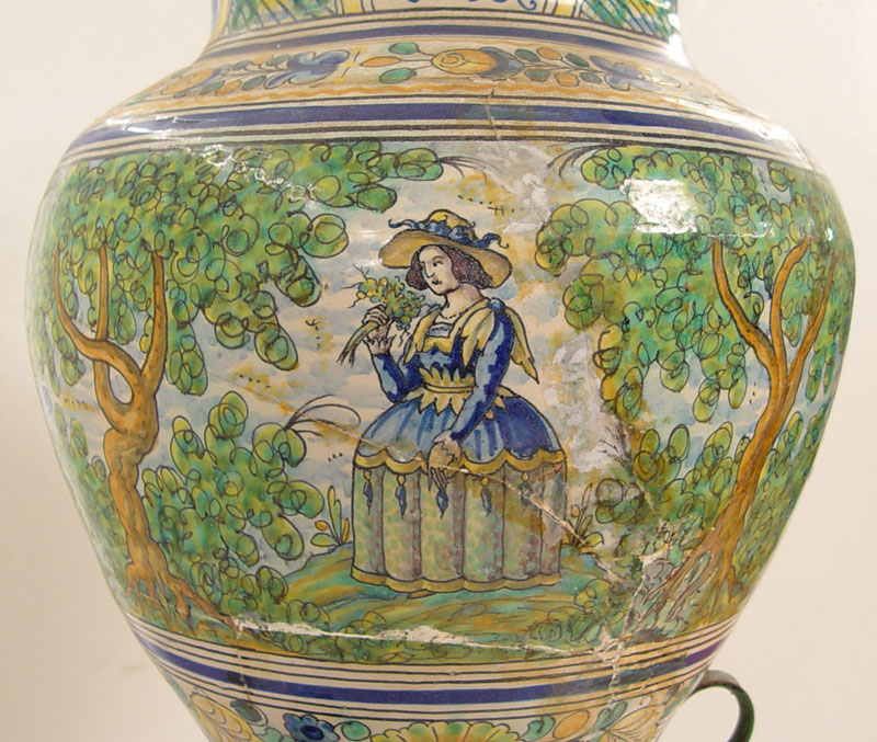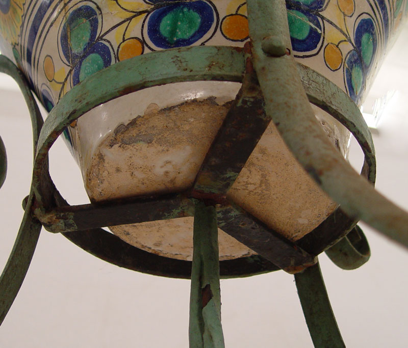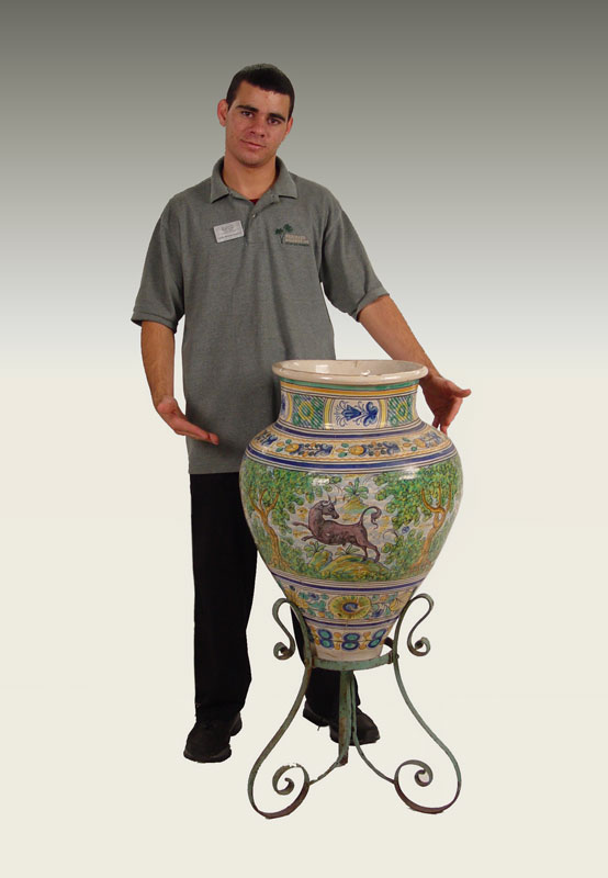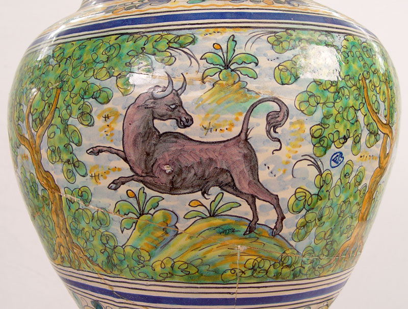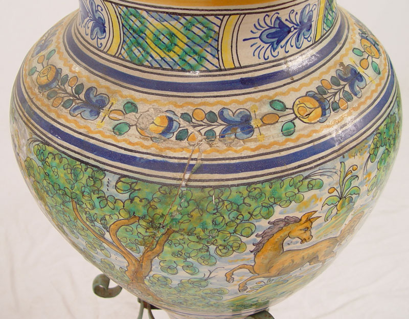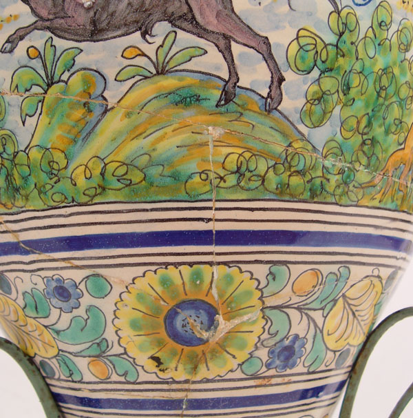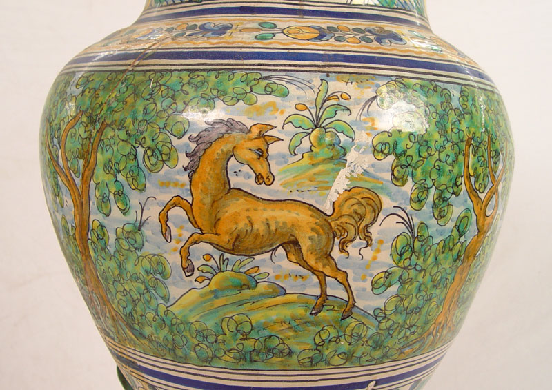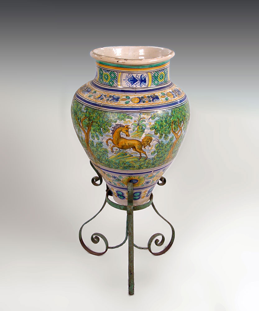 ITALIAN FAIENCE FLOOR VASE ON IRON STAND: Features horses, trees and floral decoration. Vase measures 26'' h. x 19'' dia. On metal stand 21'' x 16'' dia.