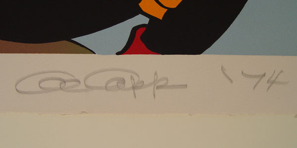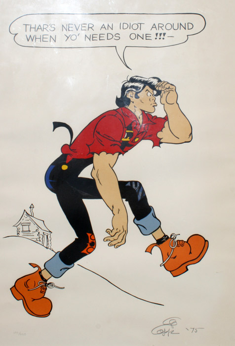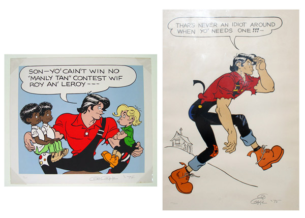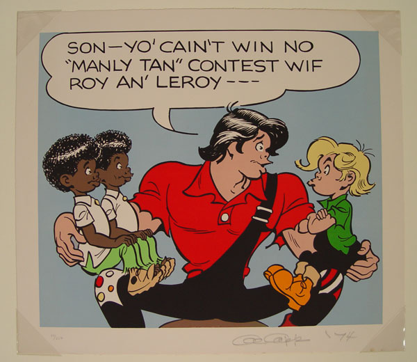 CAPP, Al, (American, 1909-1979): 2 piece serigraph to include 1) 1975 Lil' Abner, serigraph on paper, 197/250, pencil signed, sight size 31 1/2'' x 23 1/2'', contemporary frame, 34 1/2'' x 26''. 2) 1974 Lil' Abner ''Manly Tan'', serigraph on linen, pencil signed, 49/250, 23'' x 26'', with heavy display posterboard 32 1/4'' x 40''.