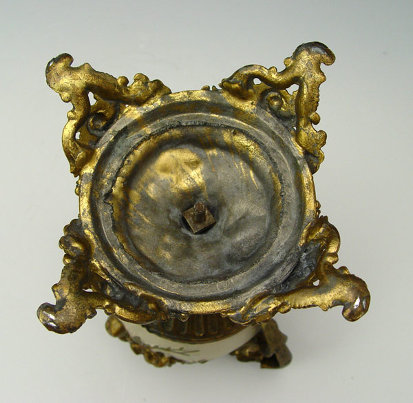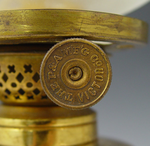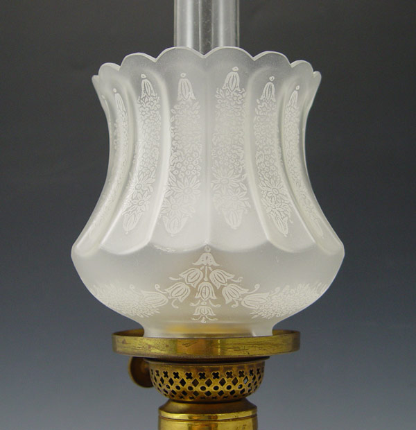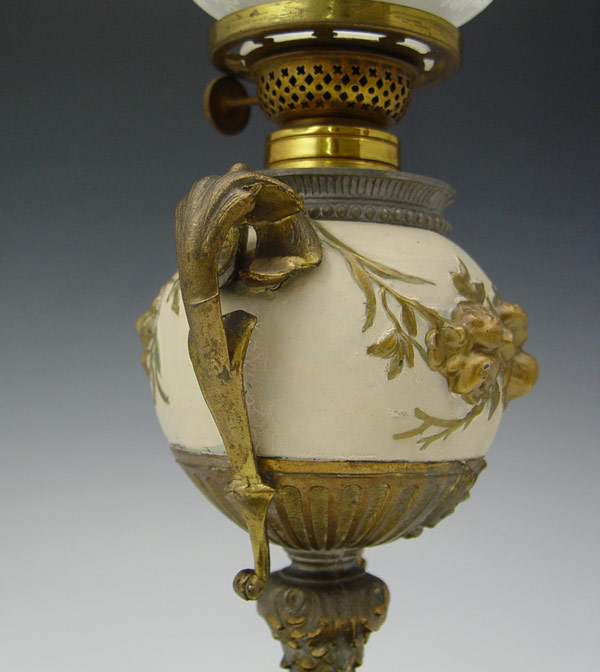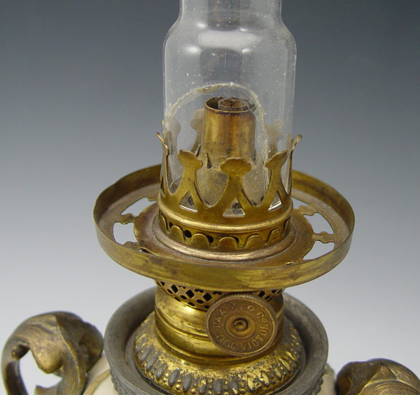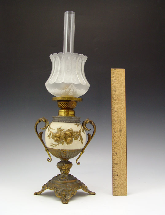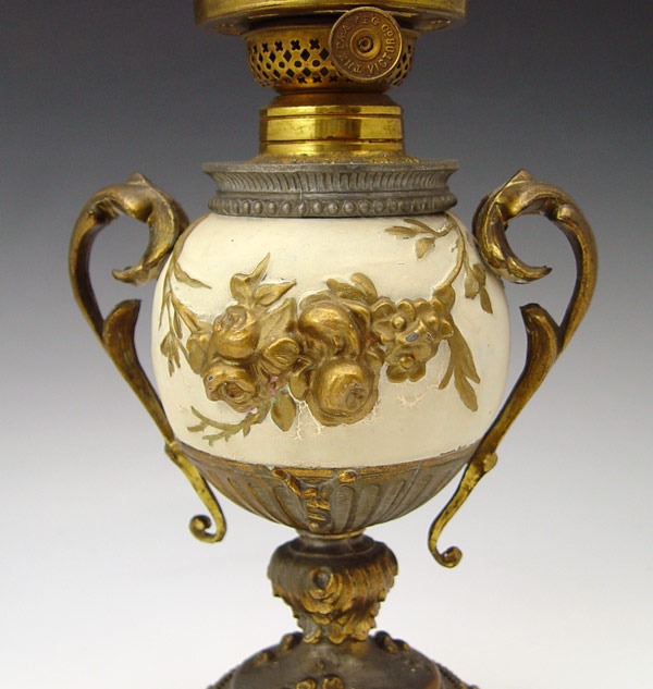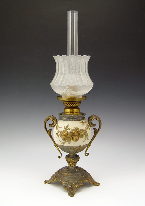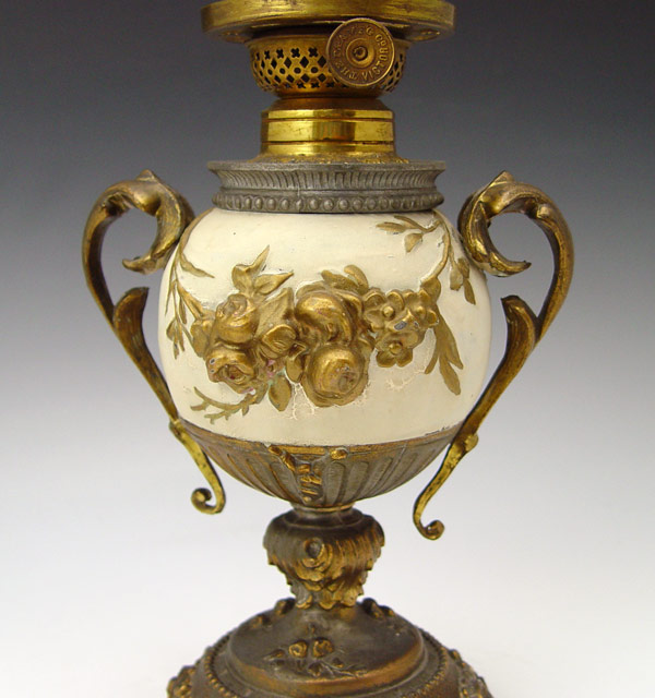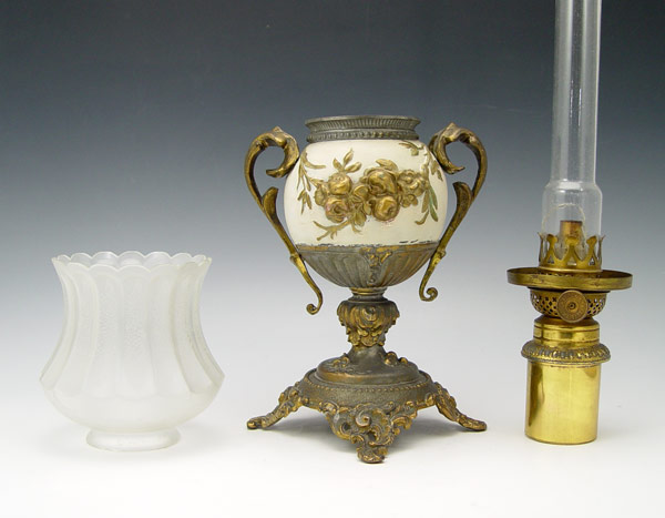 MINIATURE VICTORIAN P. A. MANUFACTURING OIL LAMP: Urn shaped with white ground and applied gilt handles and swag decoration. Removable font. Period etched glass shade probably not original, though the glass chimney is. 7 1/2'' tall x 6'' x 6''.