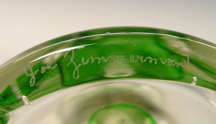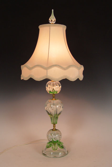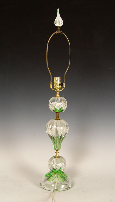 ZIMMERMAN, JOE (American 1923 - 1986) SIGNED ART GLASS PAPERWEIGHT LAMP: Four individual glass segments assembled as a lamp. Artist signed. Zimmerman Art Glass Co., Corydon, Indiana.