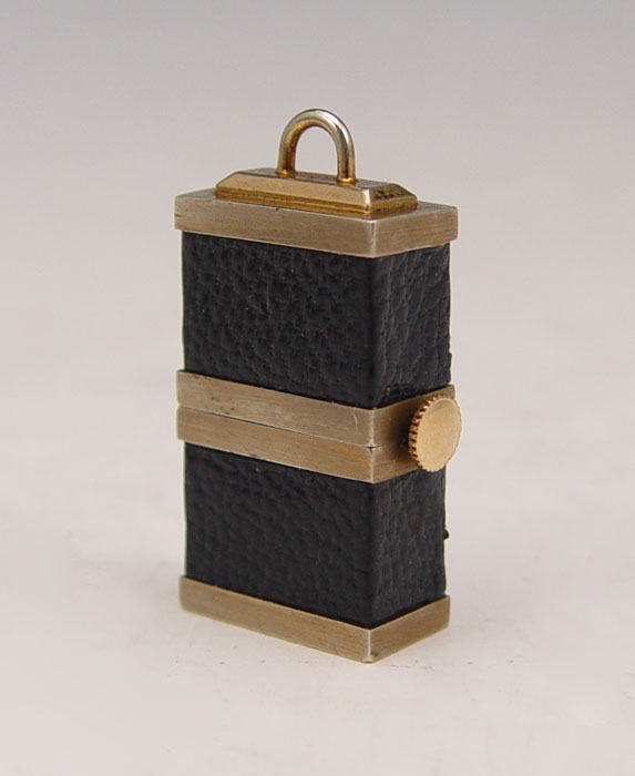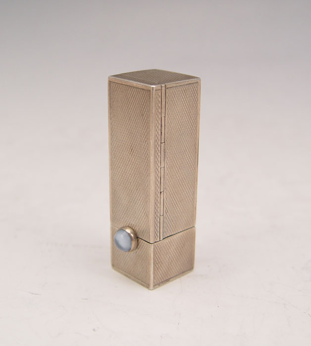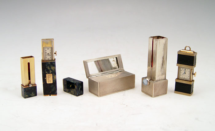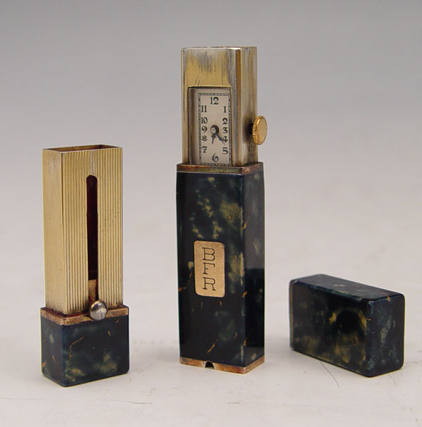 3 PIECE ART DECO LIPSTICK WATCH, TRAVEL WATCH AND LIPSTICK: 1) Enameled lipstick watch, one end has a hidden Swiss movement watch, the other a hidden lipstick, 2 3/4''l. 2) Gotham travel watch pendant, 1 1/4''. 3) Silver plated lipstick, 2 1/2''l.