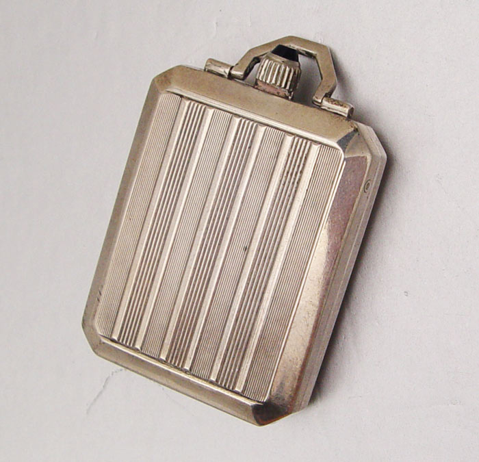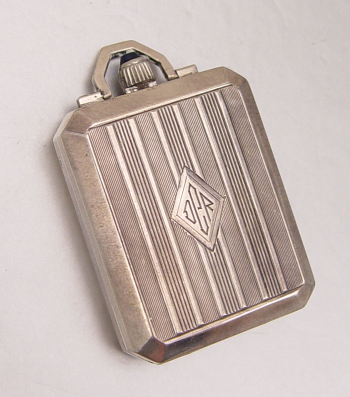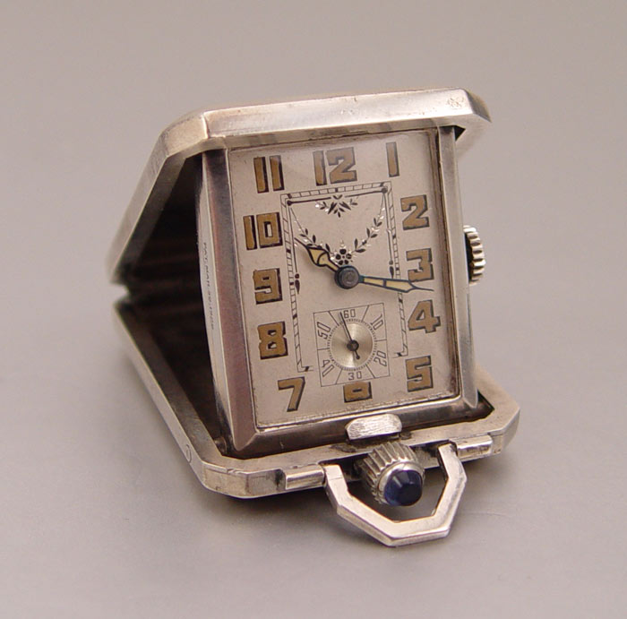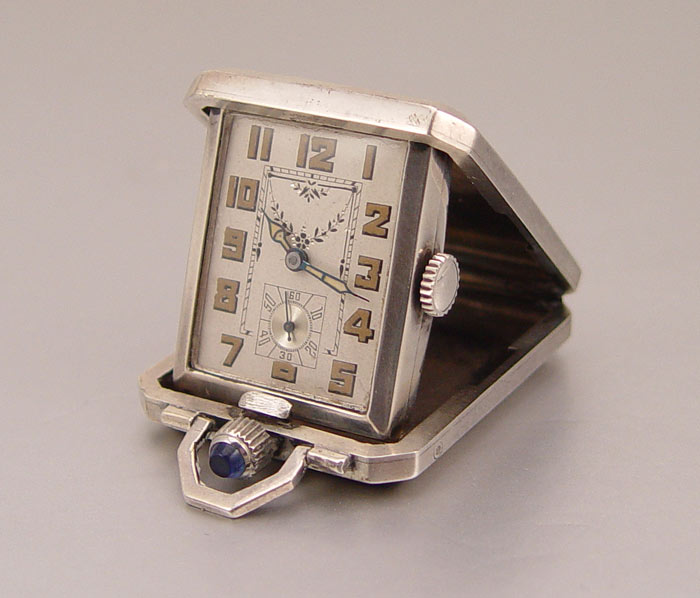 STERLING SILVER PURSE TRAVEL WATCH: Art Deco dial, circa 1925. Original jeweled crown. Marked Sterling inside case. 1 1/2'' x 1 1/4''.