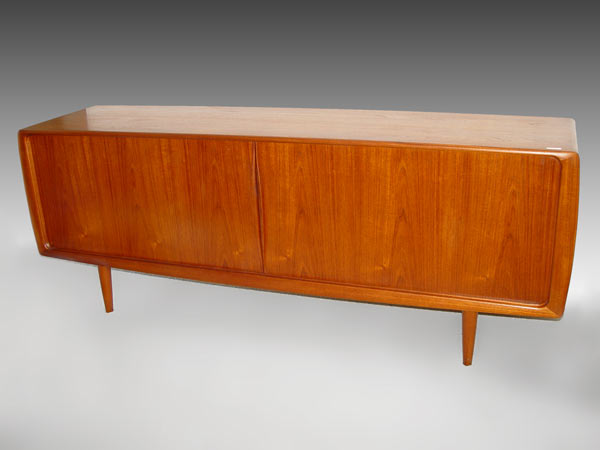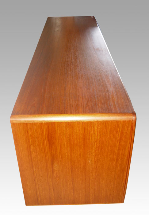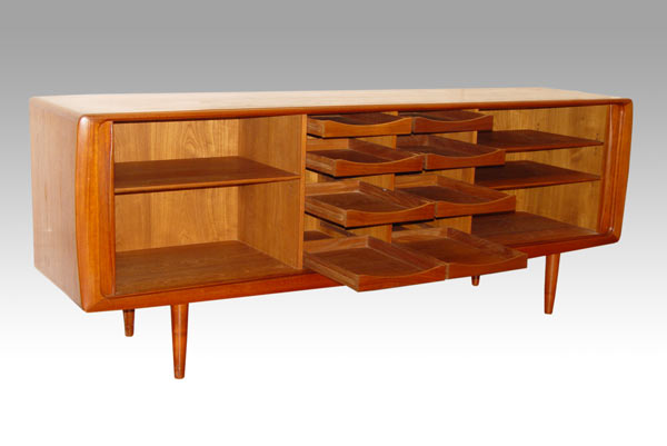 DANISH MODERN HOS WULFF TEAKWOOD TAMBOUR SIDEBOARD: The tambour slides entirely cover the front. The interior center with pull out trays. The rounded edges are the same as in the lot 44 table. 34 1/2''h. x 87'' long x 21 1/2'' deep.