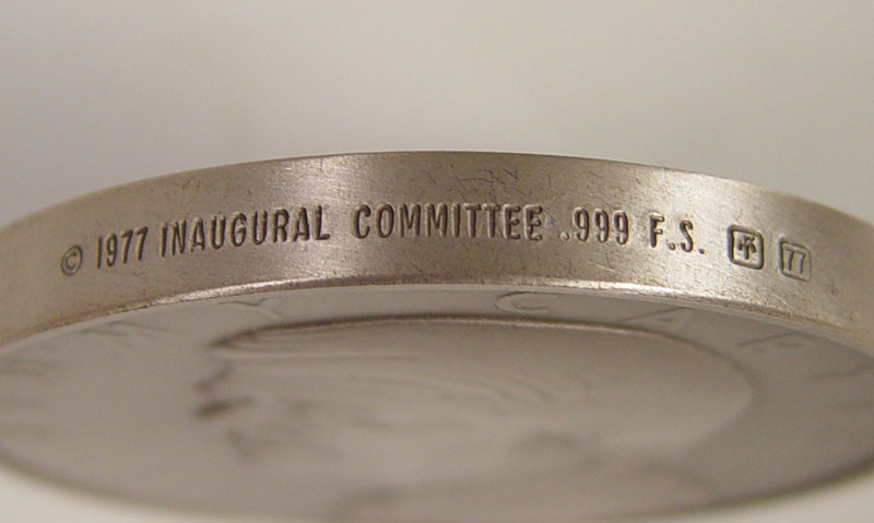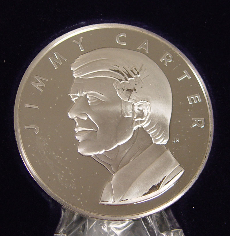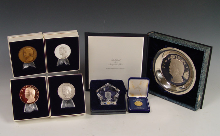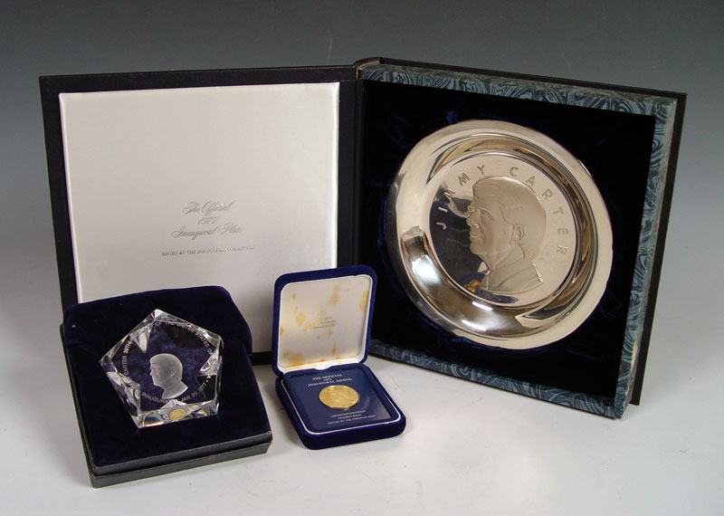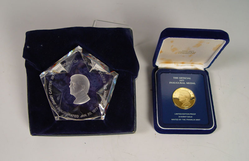 7 PIECE JIMMY CARTER PRESIDENTIAL COLLECTION: To include 1) 1977 Inaugural sterling silver plate by Franklin Mint with original case #488, approx. 9.4 troy oz. Note damage to box. 2) 1977 Franklin Mint 24K gold medal, Approx 15.7 grams, note weighed with original packaging surrounding. 3) 2 1977 Franklin Mint .999 fine silver medals, one antiqued finish, other proof finish. Approx. 12.7 troy oz. 4) 2 1977 Franklin Mint bronze medals, one antiqued finish, one proof finish. 5) 1977 Inaugural Committee crystal paperweight. All pieces have original boxes.