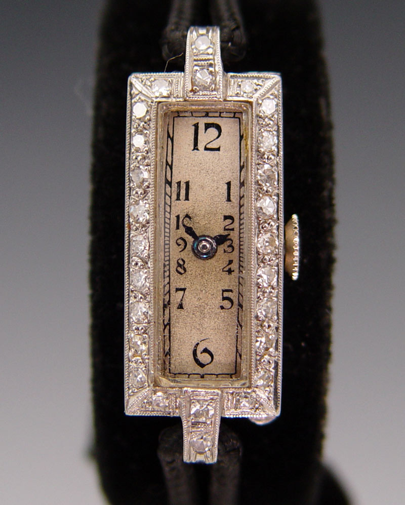PAUL PORTINAUX PLATINUM & DIAMOND WATCH: Platinum with estimated .25 carats of diamonds SI 1/2 clarity. 17 jewel Swiss made movement. Black nylon strap with standard gold filled fold over clasp.