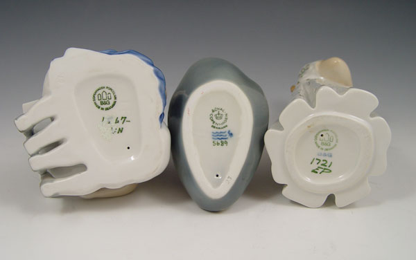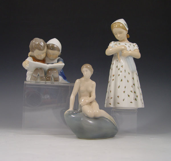 ROYAL COPENHAGEN AND BING & GRONDAHL FIGURINES: 1) Royal Copenhagen Little Mermaid 5689, designed by Edvard Erikson, 5 1/2'' tall. 2) B&G Girl with Doll, 7 1/2'' tall. 3) B&G Boy and Girl Reading 1567, 4'' tall.