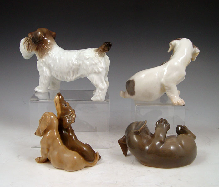 4 BING & GRONDAHL, COPENHAGEN & VOLKSTEDT DOG FIGURINES: 1) Royal Copenhagen Dachshund 1408. 2 1/2''h. 3 1/2'' length. 2) B & G Sealyham Terrier 2027, 4'' tall. 3) B & G Dachshund pair 1805, 4'' tall. 4) Volkstedt Terrier, 4'' tall, 7'' length.