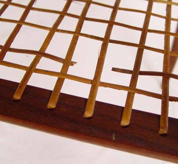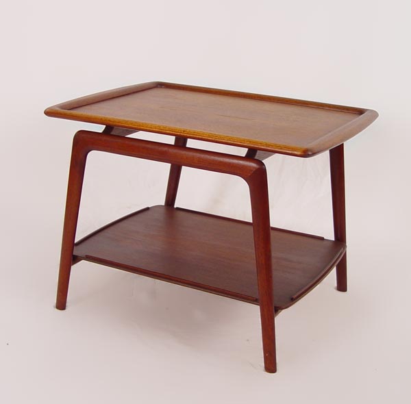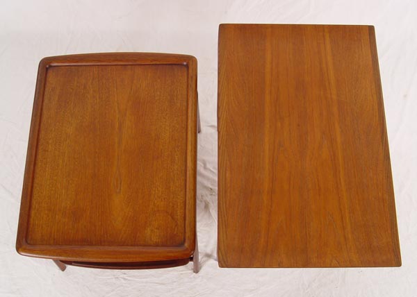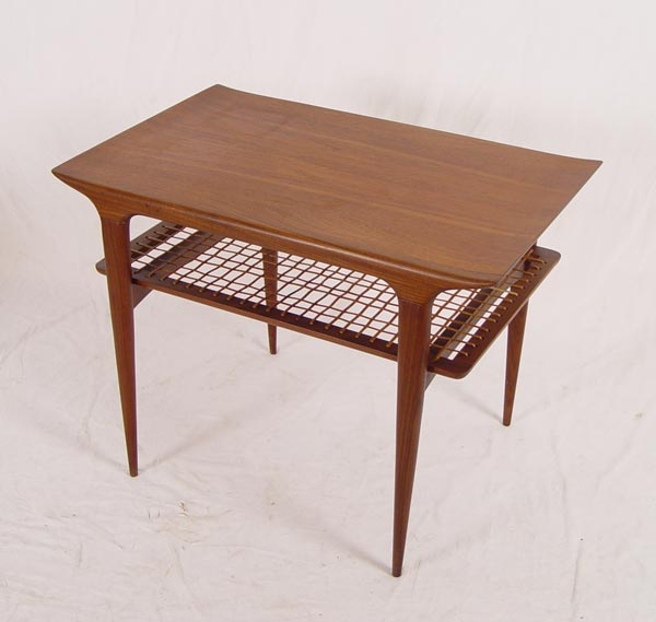 TWO DANISH MODERN TEAKWOOD SIDE TABLES: 1) Two tier table with the lower tier being caned, bears the Danish control button. 22 1/2''h. x 30'' x 19 1/2''. 2) Two tier table, 19 1/2'' x 20'' x2 7''. Bears a Made In Denmark Craftsmanship button.