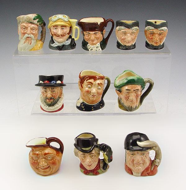 ROYAL DOULTON MINIATURE JUGS: Eleven assorted jugs to include, AULD MAC D 6253; BEEFEATER D 6251, 1946, crazing on bottom; FAT BOY, crazing on bottom; GONE AWAY D 6545, 1959; GRANNY D 6520, 1968; GRANNY D 6520, 1972; JOHN BARLEYCORN marked A (probably D 6041), 1974; OLD CHARLEY D 6046; ROBINSON CRUSOE D 6546, 1959; VETERAN MOTORIST D 6641, 1972; and WALRUS & CARPENTER D 6608, 1964.